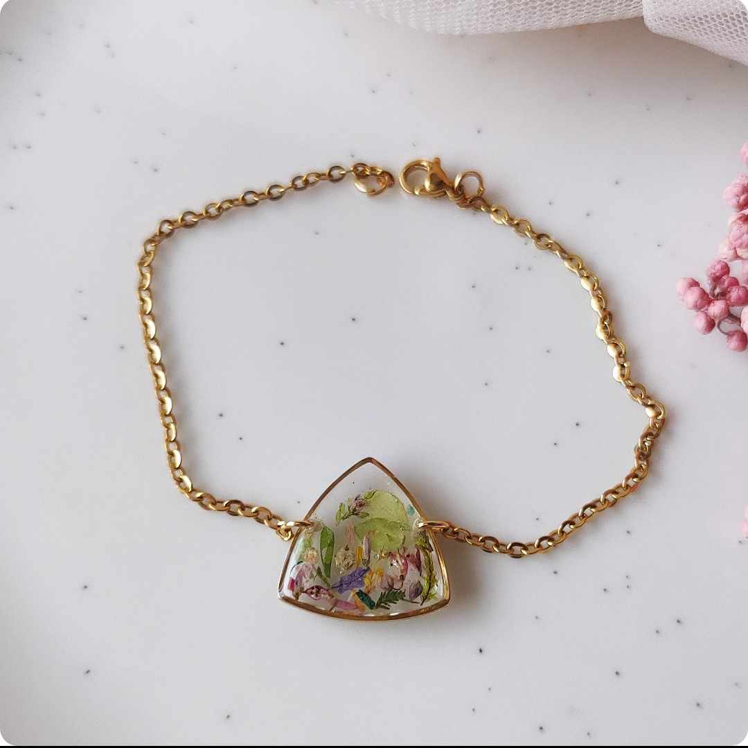 Bransoletka z kwiatami na bezbarwnym tle. Biżuteria idealna dla kobiet lubiących kontakt z naturą i nietuzinkową biżuterię. Polecamy szczególnie dla tych z nas, które uwielbiają zadać szyku niewielkim elementem. Niewielkim rozmiarem, potężnym jednak w pierwszym wrażeniu!