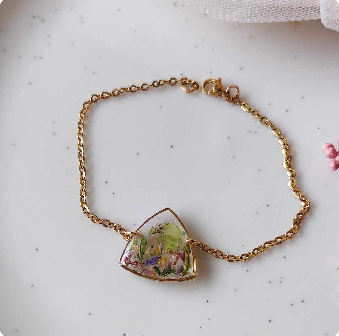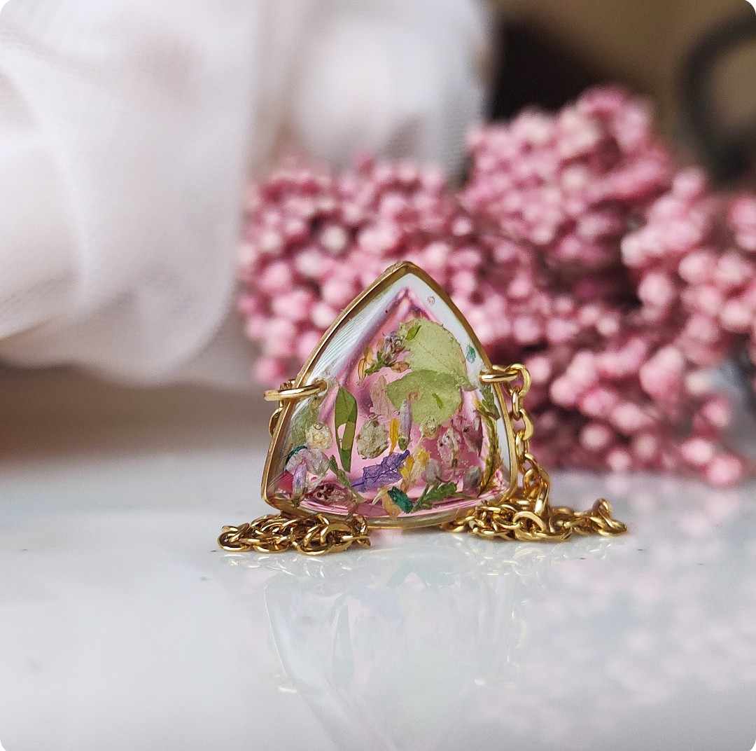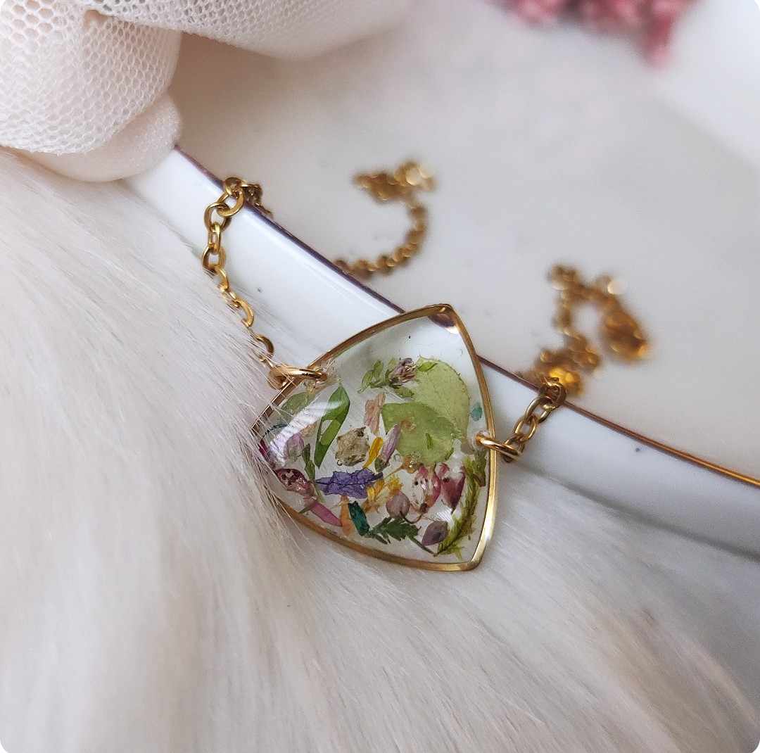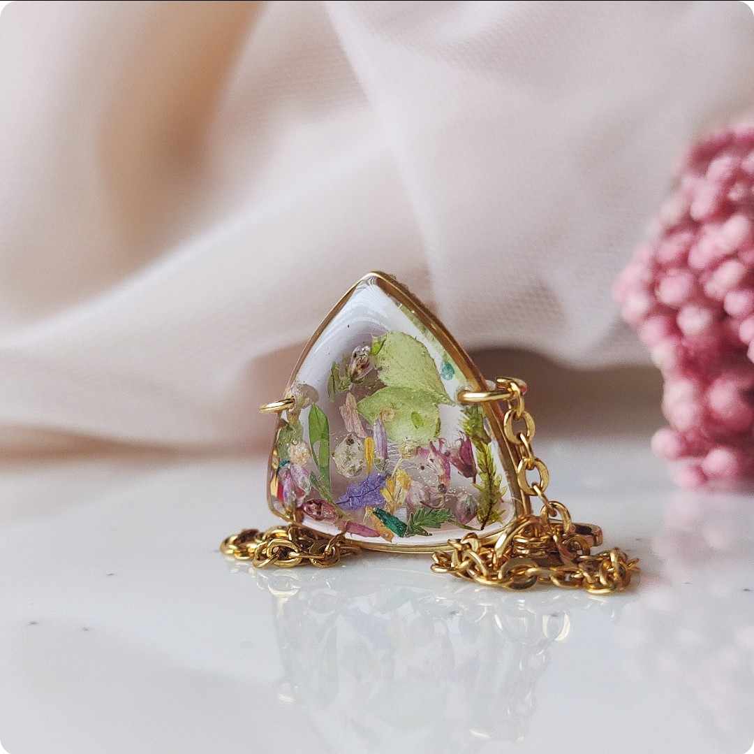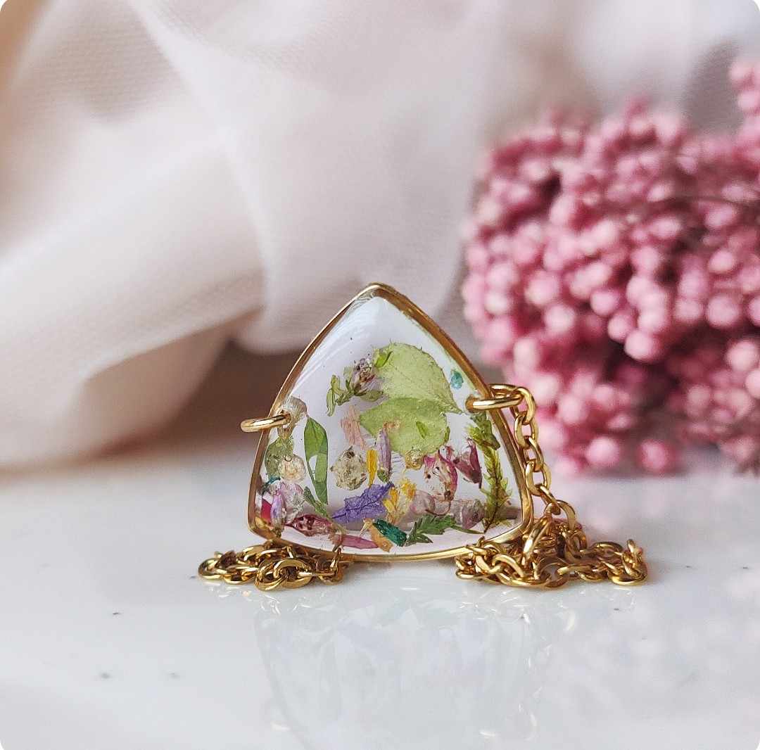 Żywica epoksydowa pozwala na utrwalenie kruchej i ulotnej cząstki natury. Jest krystaliczna i lekka. Stal szlachetna ma właściwości hipoalergiczne, nie odbarwia się i jest w dużym stopniu odporna na zarysowania. Przy odpowiedniej pielęgnacji biżuteria z tych materiałów jest gwarancją długiego użytkowania