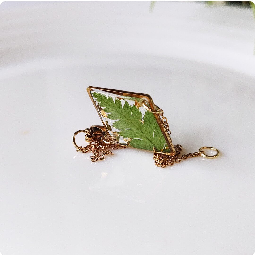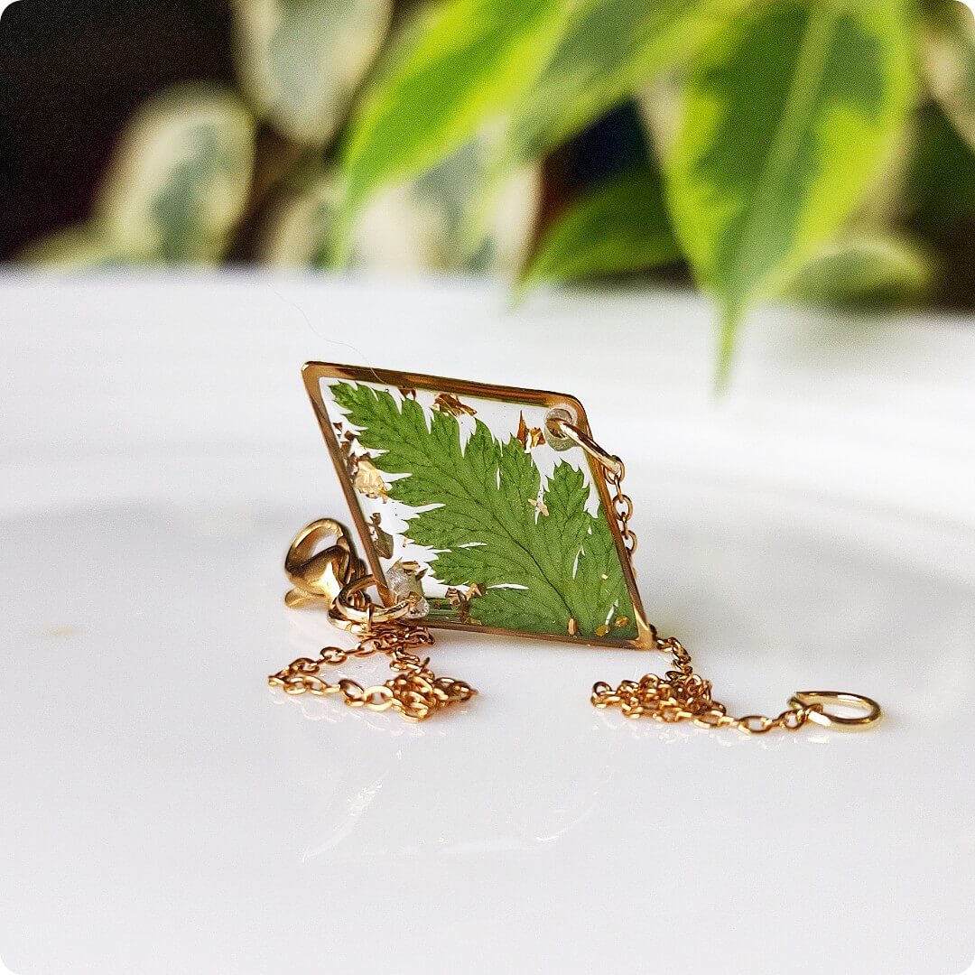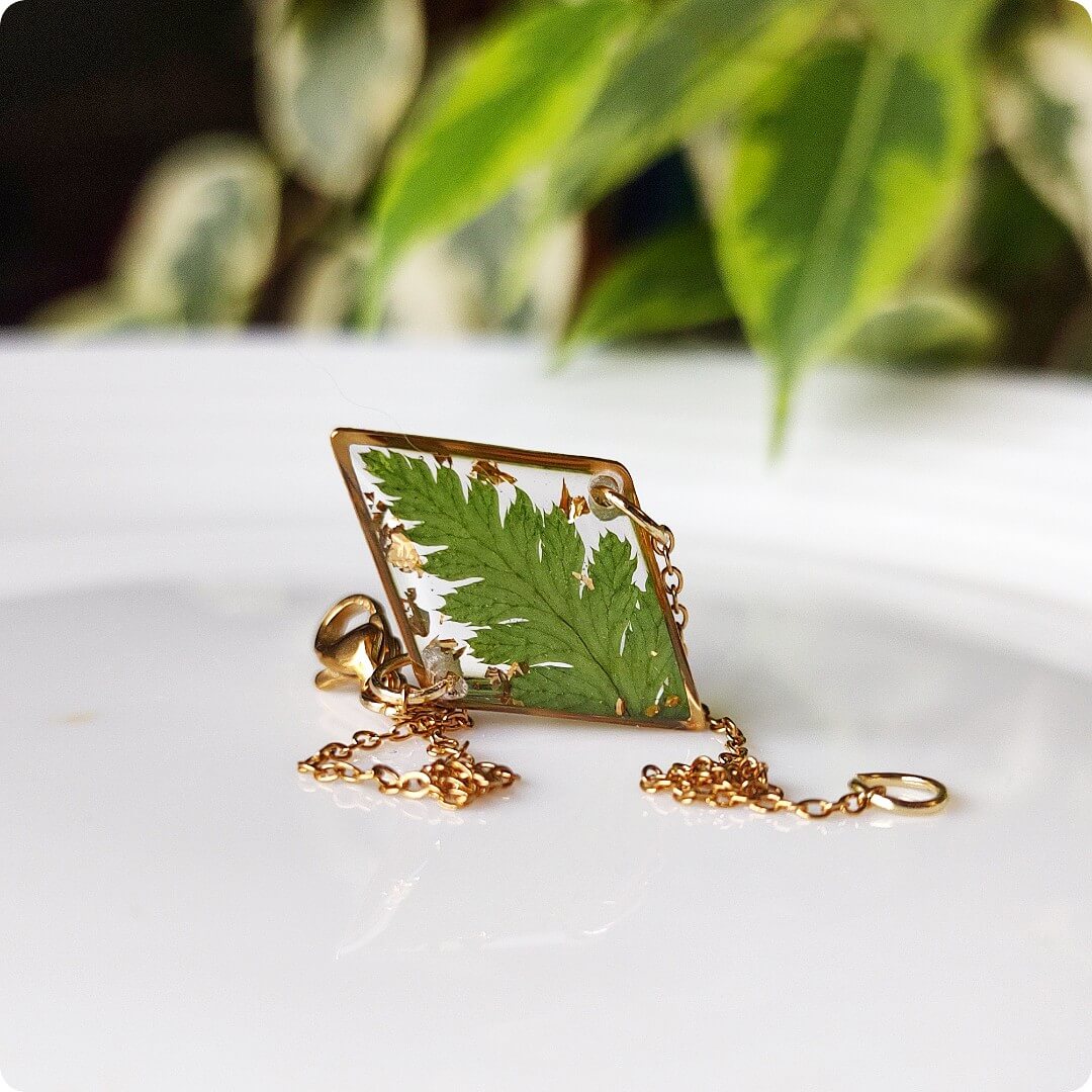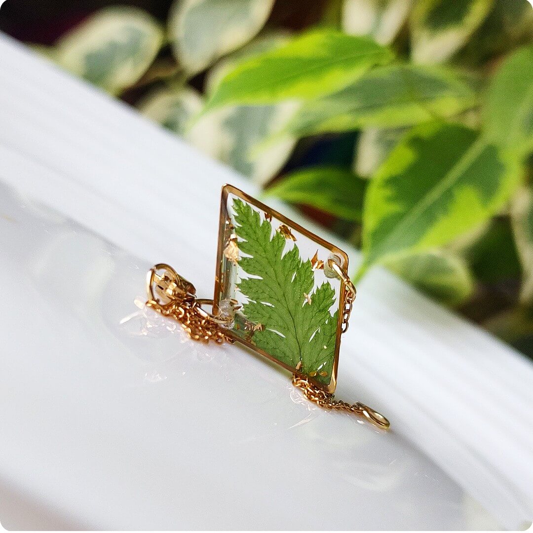Żywica epoksydowa pozwala na utrwalenie kruchej i ulotnej cząstki natury. Jest krystaliczna i lekka. Stal szlachetna ma właściwości hipoalergiczne, nie odbarwia się i jest w dużym stopniu odporna na zarysowania. Przy odpowiedniej pielęgnacji biżuteria z tych materiałów jest gwarancją długiego użytkowania