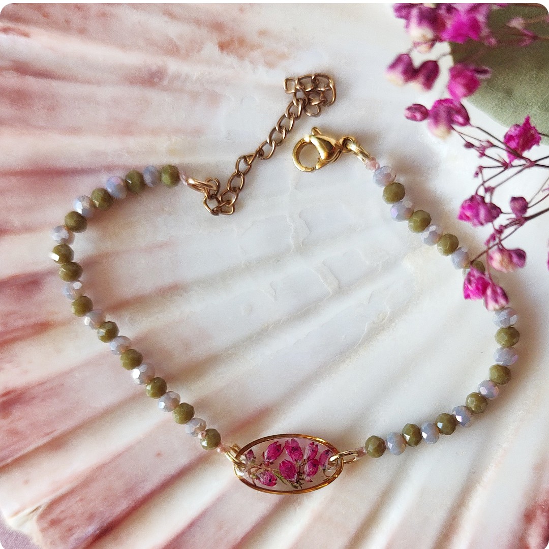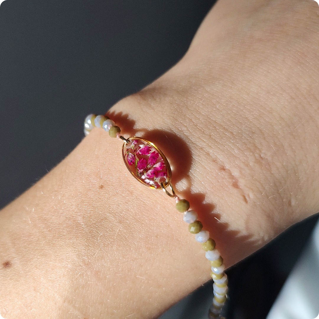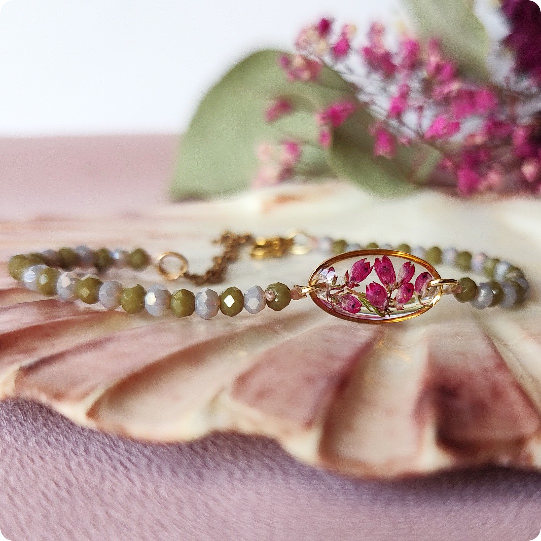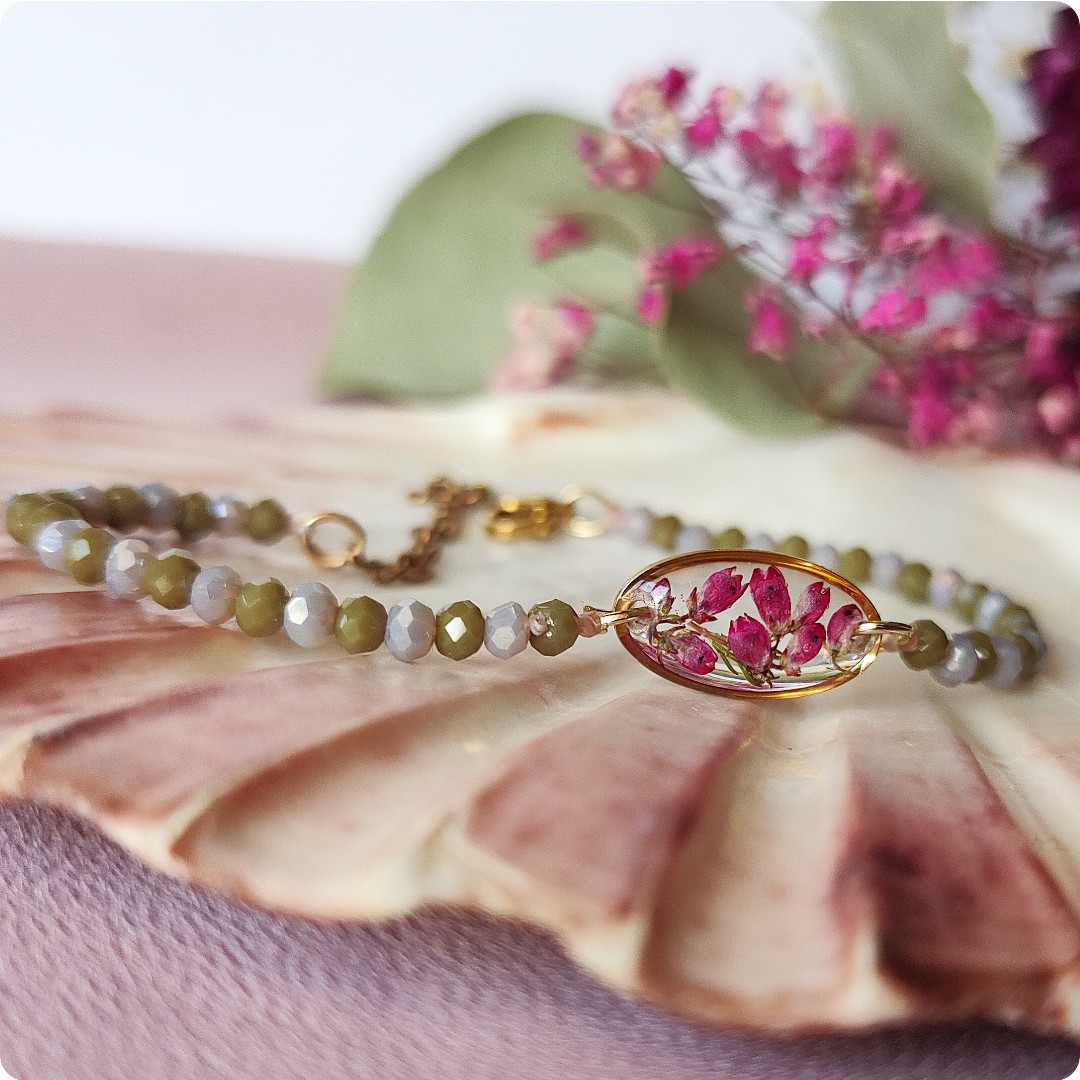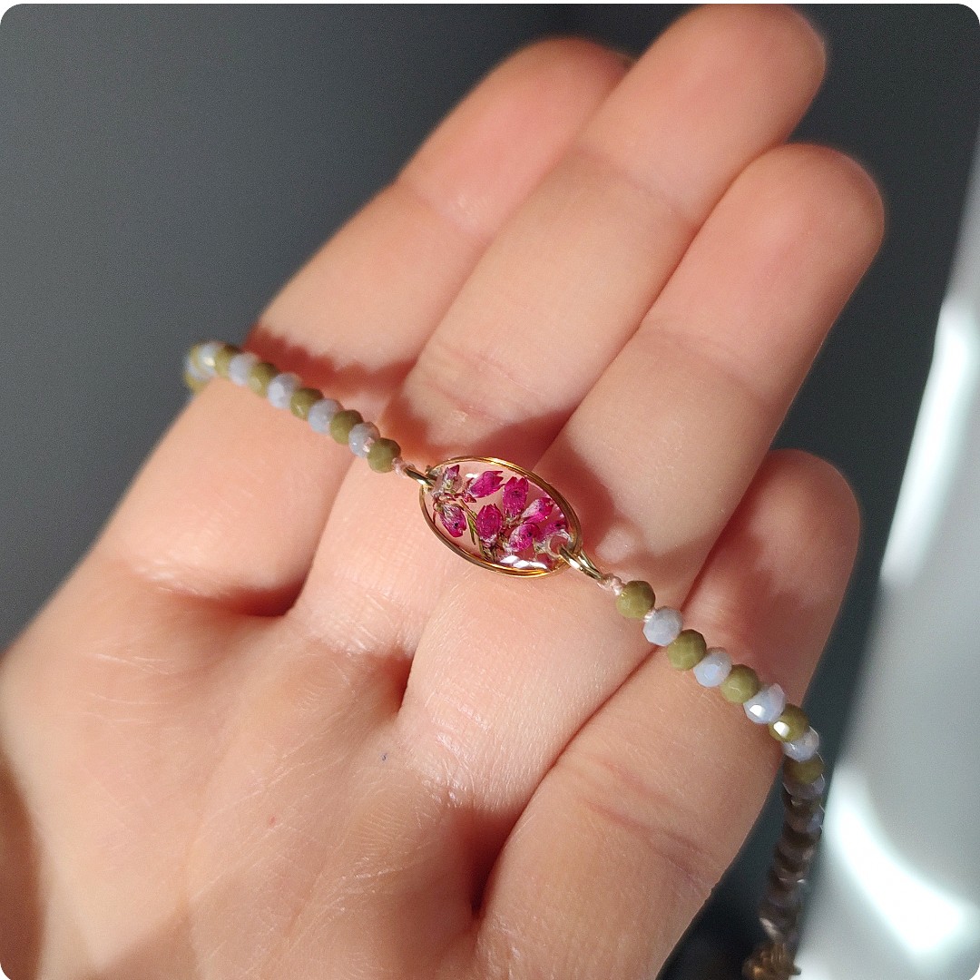 Bransoletka z wrzosami na bezbarwnym tle. Kwiat wrzosu reprezentuje powodzenie, niezależność i szczęście . Jeśli chcesz życzyć wszystkiego najlepszego bliskiej Ci osobie lub chcesz przyciągnąć radość do życia tej osoby, kwiat wrzosu będzie idealnym prezentem.