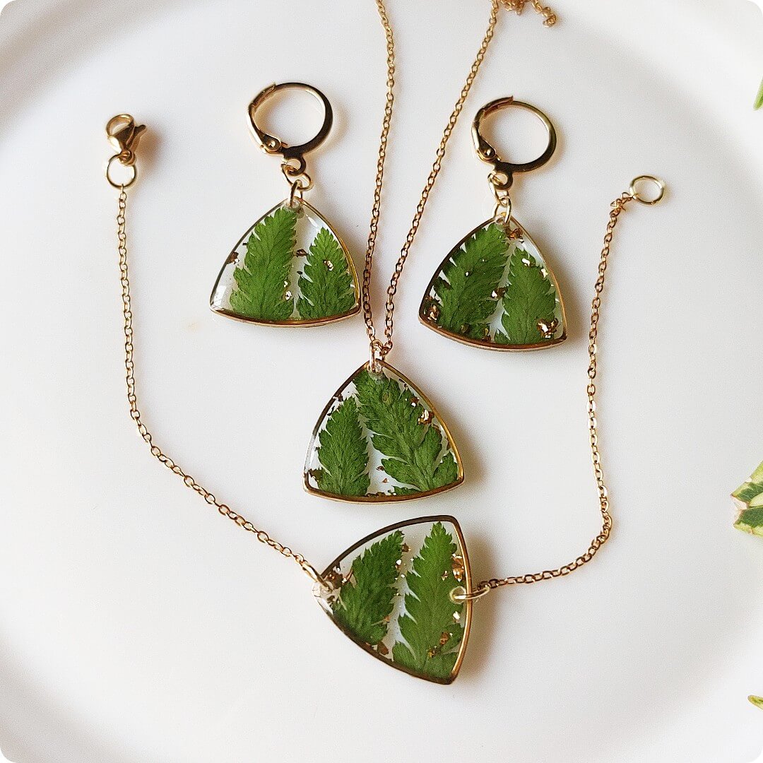 Duży komplet biżuterii z paprocią na bezbarwnym tle. Od wieków paproci przypisuje się magiczne znaczenie, jest symbolem dobrobytu, szczęścia i powodzenia. Biżuteria idealna dla kobiet kochających naturę i nietuzinkowy styl.