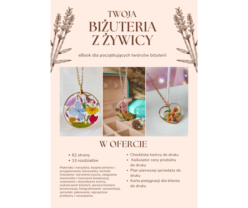 Tworzenie biżuterii z żywicy może być pasją, relaksem… ale też realnym źródłem dochodu. Wszystko zaczyna się od wiedzy i dobrze zaplanowanego działania. Jeśli czujesz, że to coś dla Ciebie – ten e-book jest kolejnym krokiem.