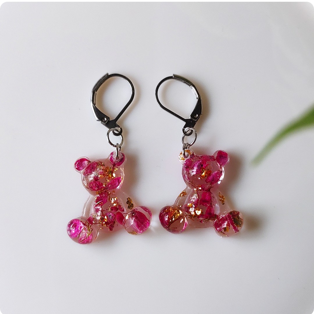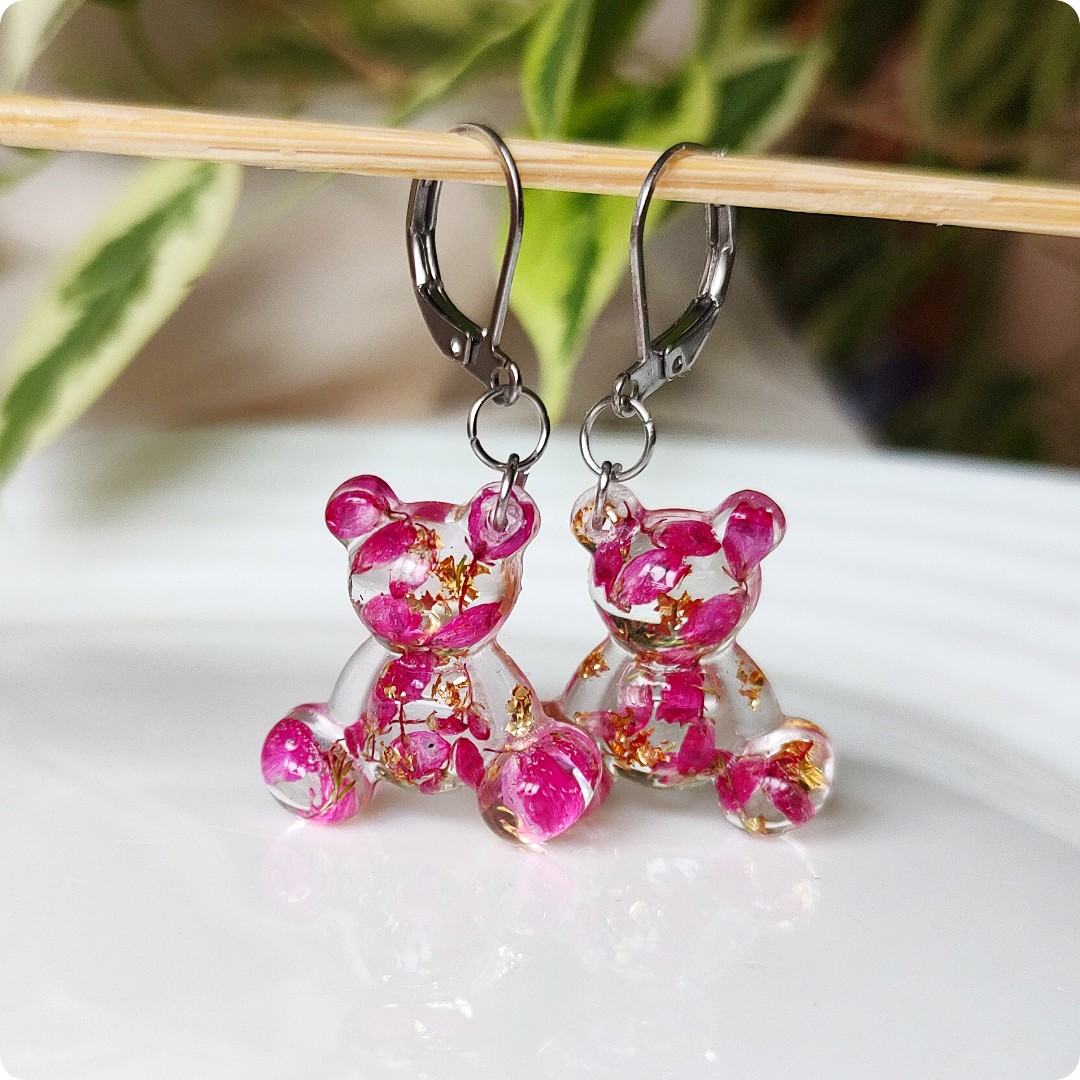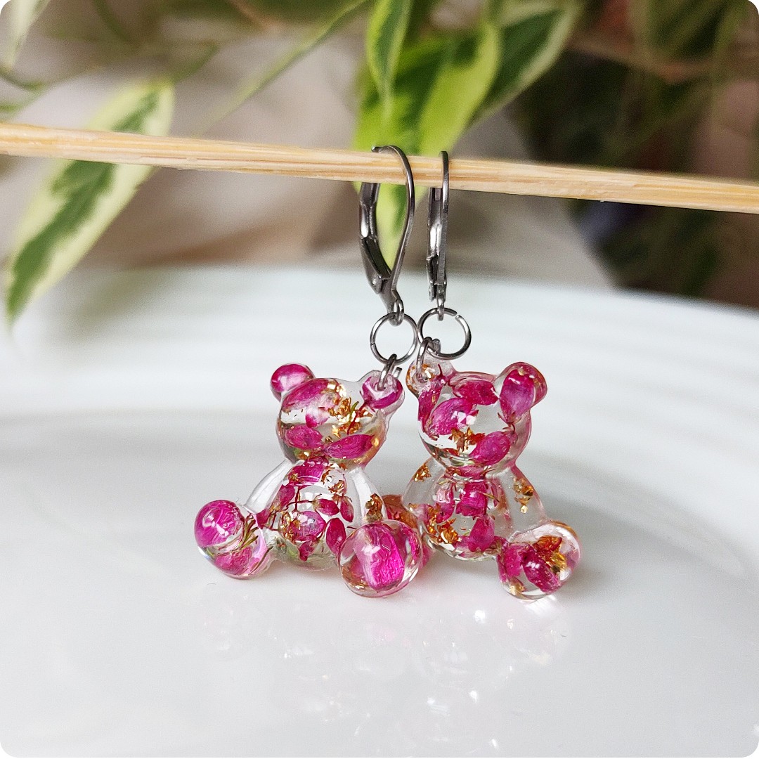 Kolczyki misie z wrzosami na bezbarwnym tle. Kwiat wrzosu reprezentuje powodzenie, niezależność i szczęście . Jeśli chcesz życzyć wszystkiego najlepszego bliskiej Ci osobie lub chcesz przyciągnąć radość do życia tej osoby, kwiat wrzosu będzie idealnym prezentem.