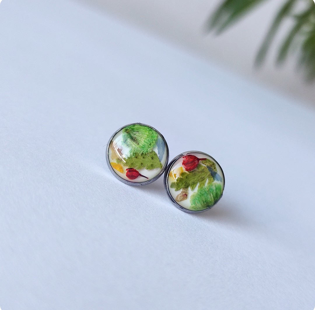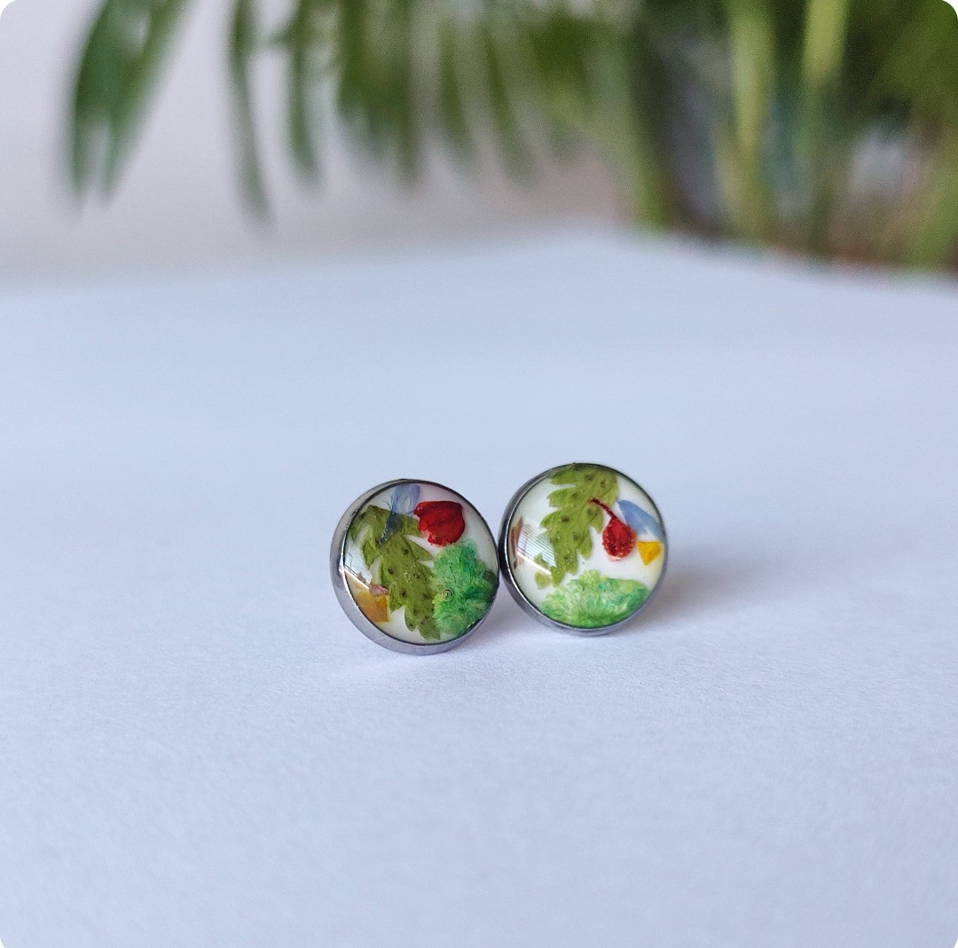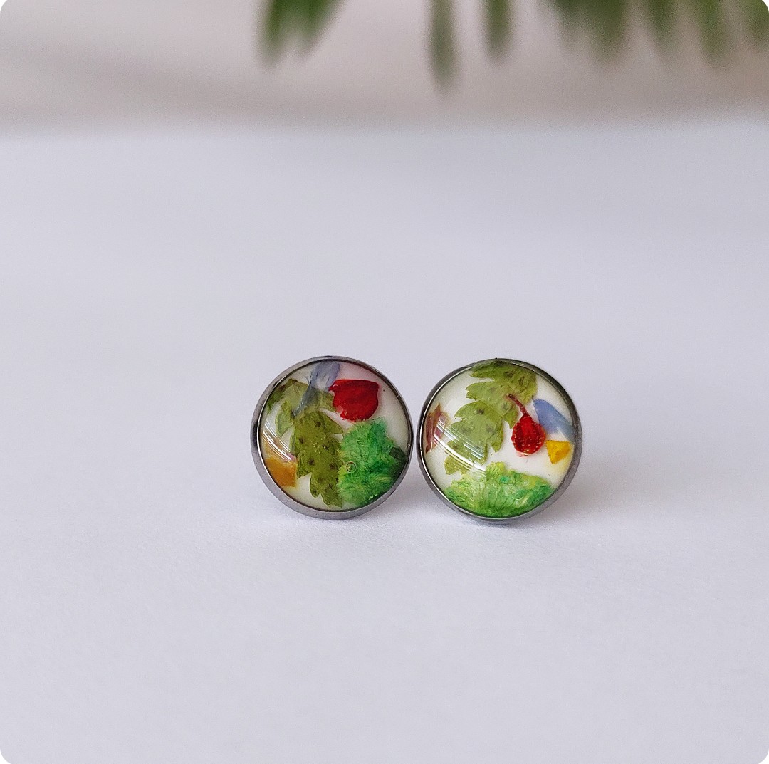 Kolczyki sztyfty z kwiatami na białym tle. Biżuteria idealna dla kobiet lubiących kontakt z naturą i nietuzinkową biżuterię. Przejrzystość formy połączona z feerią barw kwiatowych elementów – zachwyca! Polecamy szczególnie dla tych z nas, które uwielbiają zadać szyku niewielkim elementem. Niewielkim rozmiarem, potężnym jednak w pierwszym wrażeniu!
