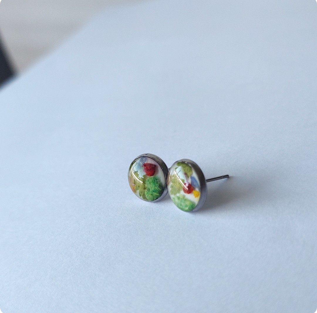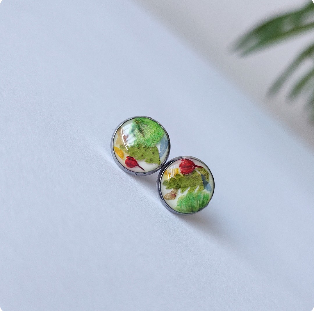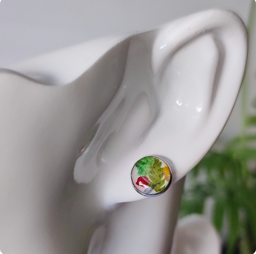 Kolczyki sztyfty z kwiatami na białym tle. Biżuteria idealna dla kobiet lubiących kontakt z naturą i nietuzinkową biżuterię. Przejrzystość formy połączona z feerią barw kwiatowych elementów – zachwyca! Polecamy szczególnie dla tych z nas, które uwielbiają zadać szyku niewielkim elementem. Niewielkim rozmiarem, potężnym jednak w pierwszym wrażeniu!