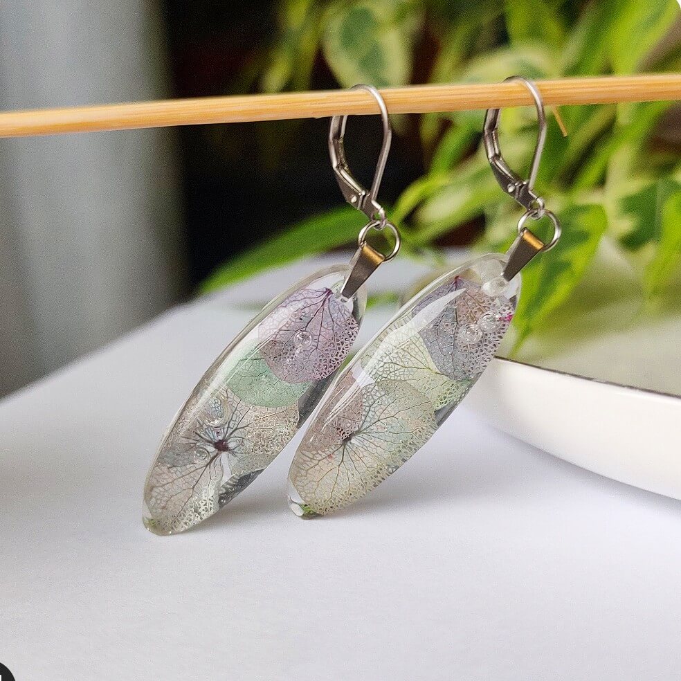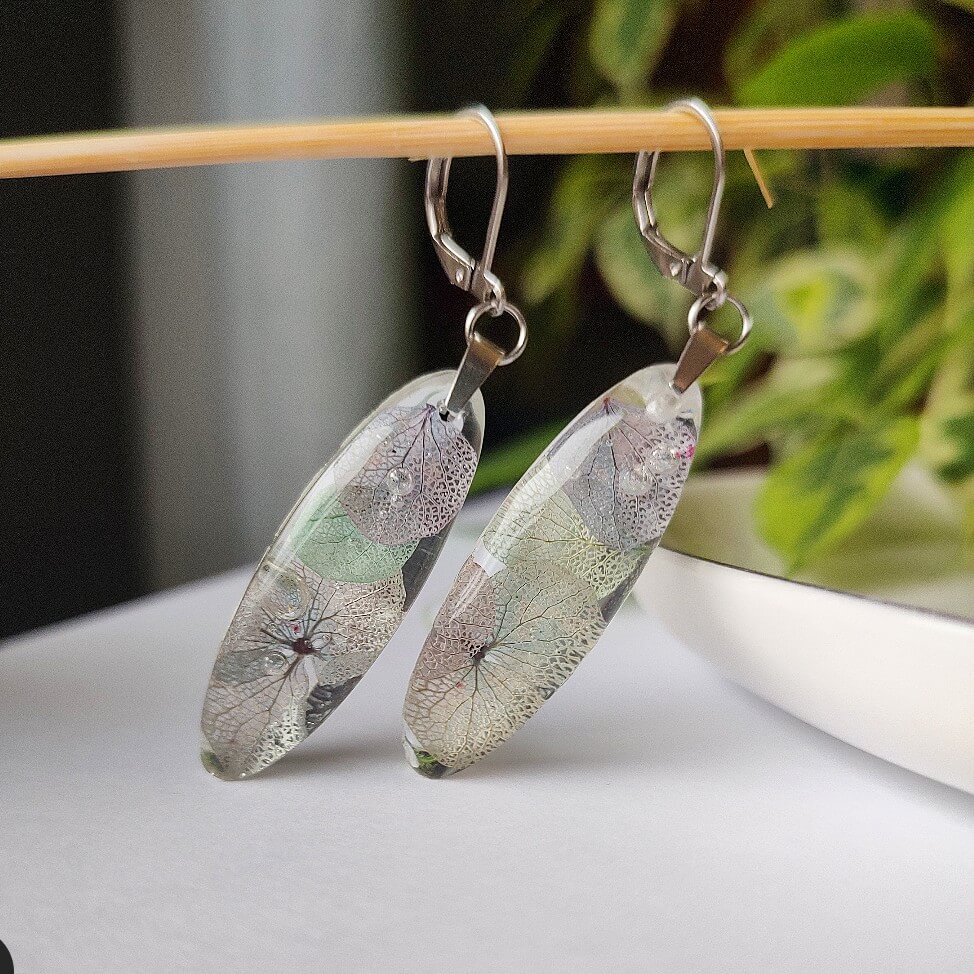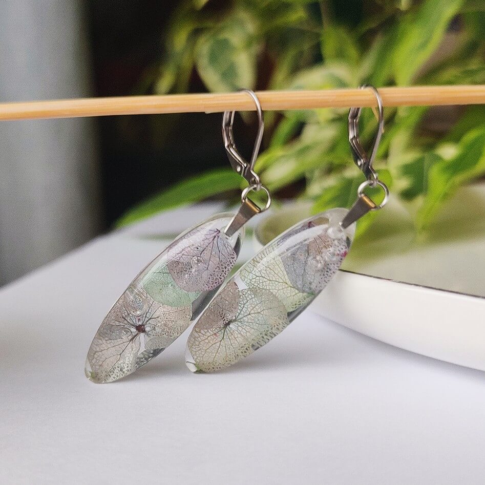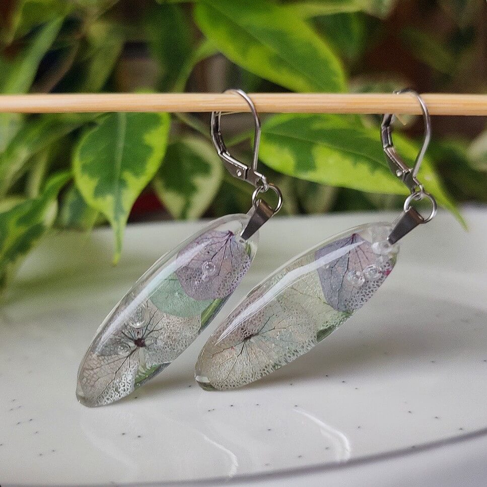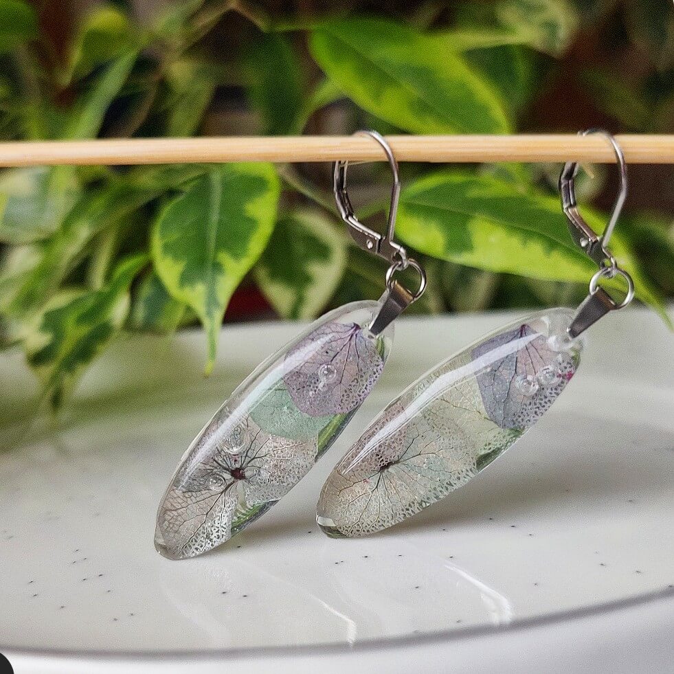 Kolczyki z kwiatami hortensji na bezbarwnym tle. Biżuteria idealna dla kobiet lubiących kontakt z naturą i nietuzinkową biżuterię. Polecamy szczególnie dla tych z nas, które uwielbiają zadać szyku niewielkim elementem. Niewielkim rozmiarem, potężnym jednak w pierwszym wrażeniu!