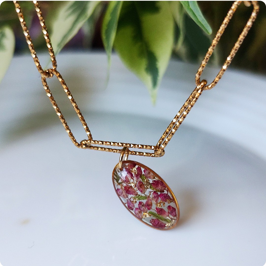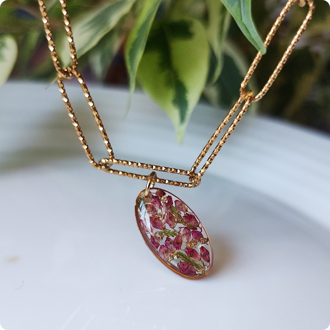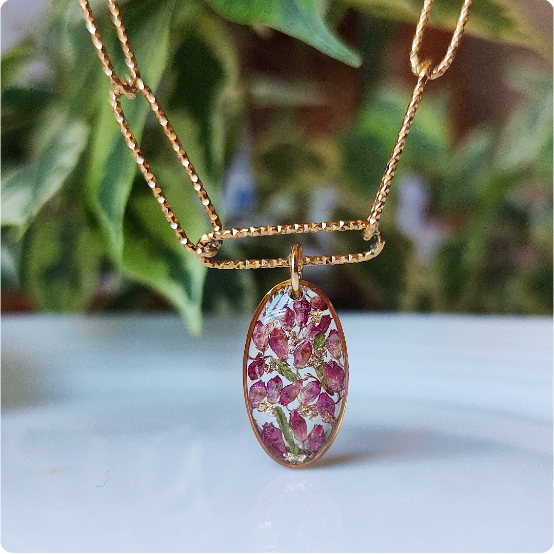 Naszyjnik choker z wrzosami na bezbarwnym tle. Kwiat wrzosu reprezentuje powodzenie, niezależność i szczęście . Jeśli chcesz życzyć wszystkiego najlepszego bliskiej Ci osobie lub chcesz przyciągnąć radość do życia tej osoby, kwiat wrzosu będzie idealnym prezentem.
