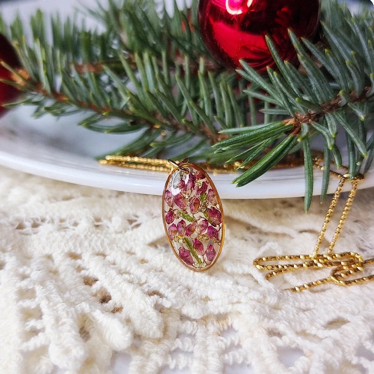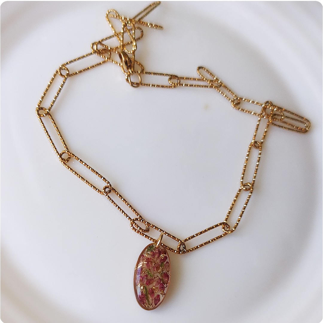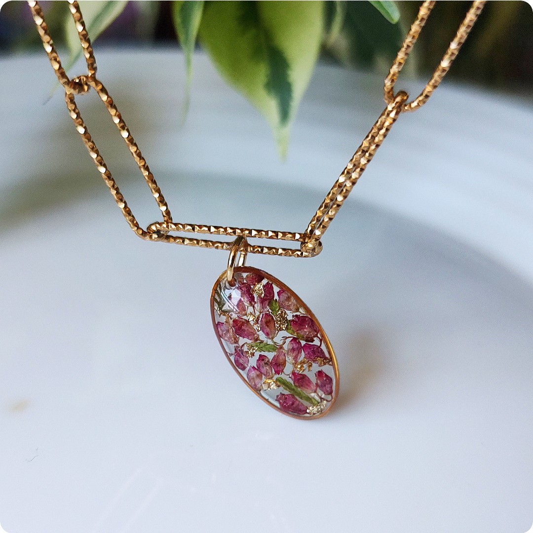 Naszyjnik choker z wrzosami na bezbarwnym tle. Kwiat wrzosu reprezentuje powodzenie, niezależność i szczęście . Jeśli chcesz życzyć wszystkiego najlepszego bliskiej Ci osobie lub chcesz przyciągnąć radość do życia tej osoby, kwiat wrzosu będzie idealnym prezentem.