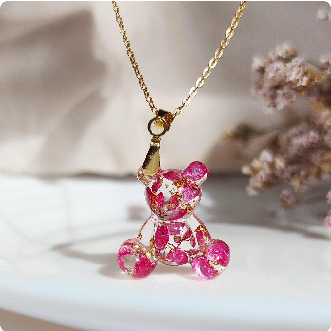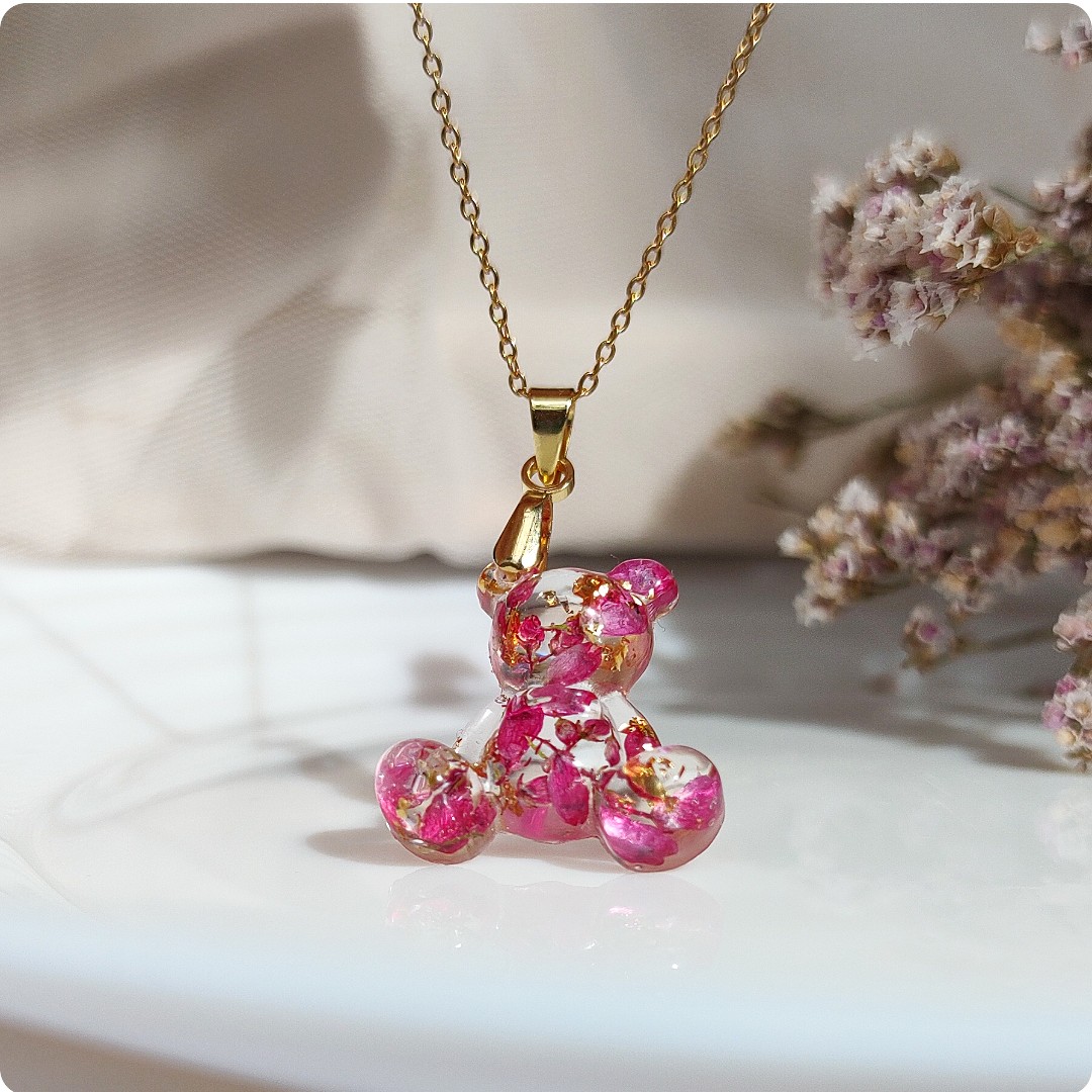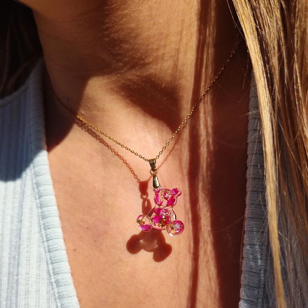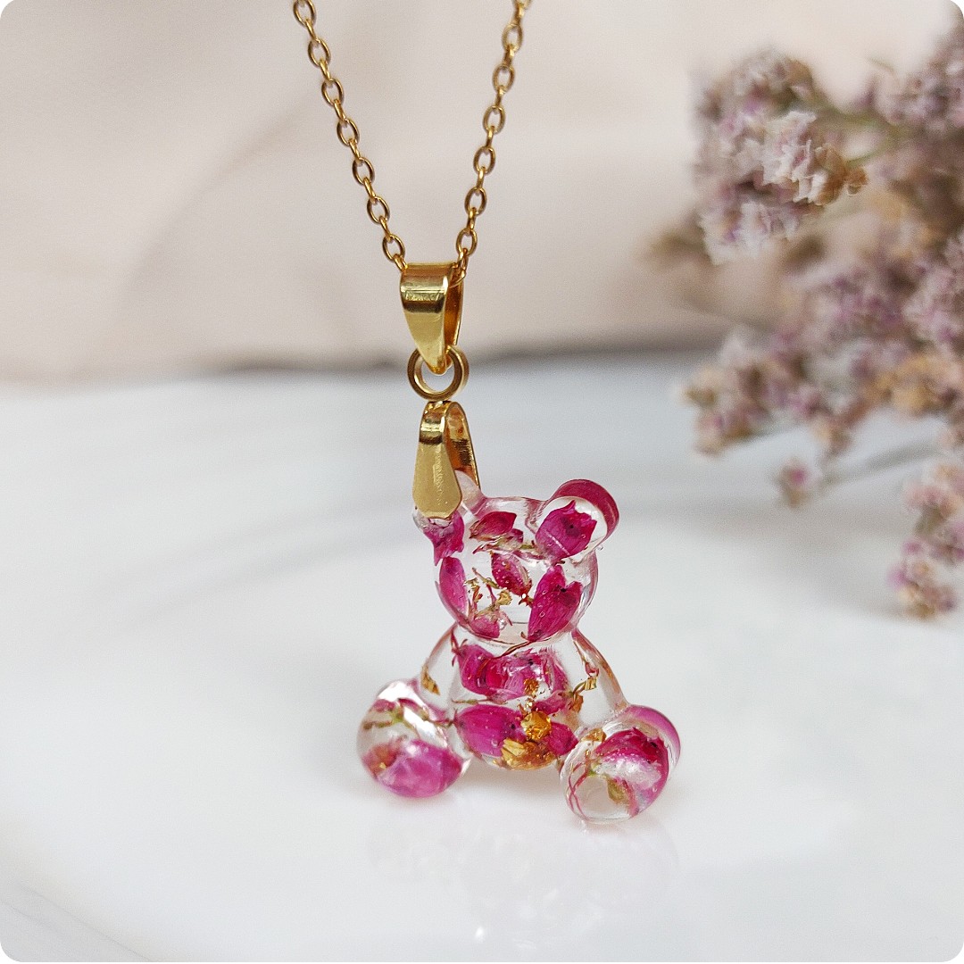Naszyjnik miś z wrzosami na bezbarwnym tle. Kwiat wrzosu reprezentuje powodzenie, niezależność i szczęście . Jeśli chcesz życzyć wszystkiego najlepszego bliskiej Ci osobie lub chcesz przyciągnąć radość do życia tej osoby, kwiat wrzosu będzie idealnym prezentem.