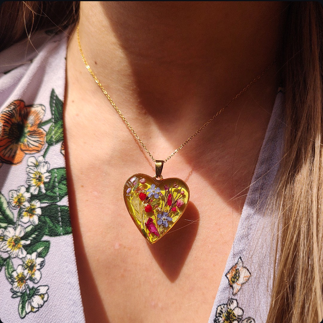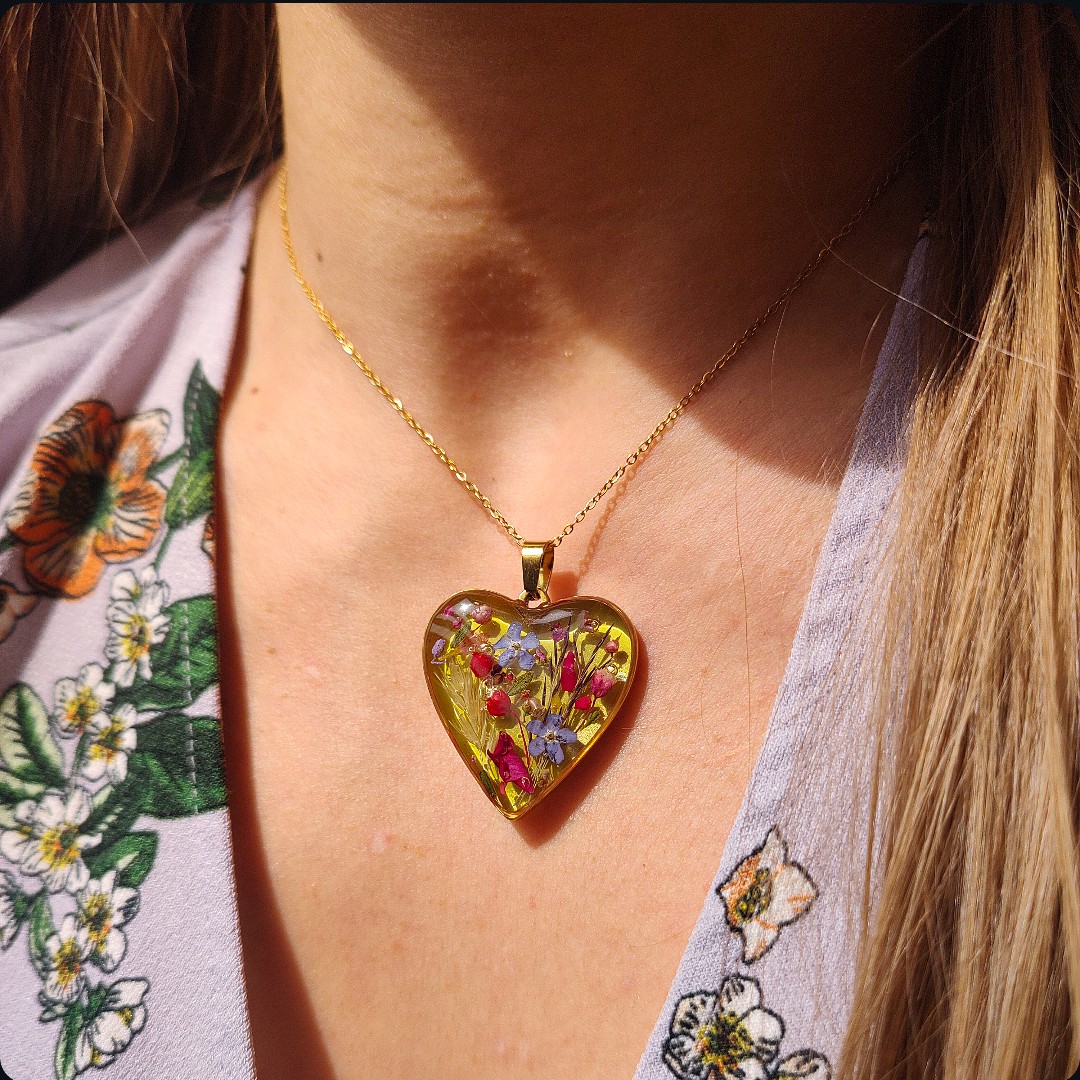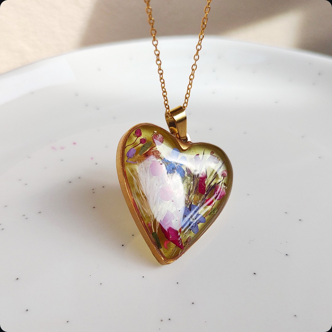 Naszyjnik serce z kwiatami na zielonym tle. Biżuteria idealna dla kobiet lubiących kontakt z naturą i nietuzinkową biżuterię. Polecamy szczególnie dla tych z nas, które uwielbiają zadać szyku niewielkim elementem. Niewielkim rozmiarem, potężnym jednak w pierwszym wrażeniu!
