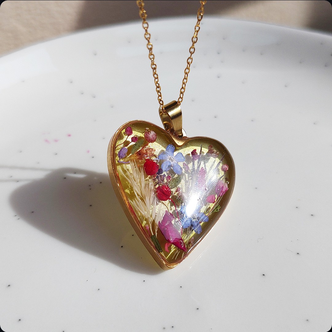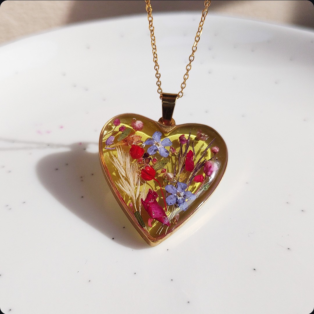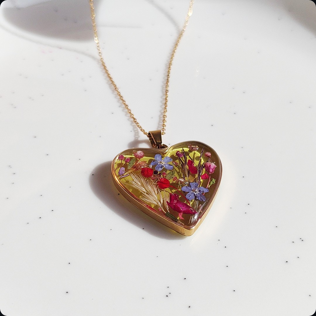 Naszyjnik serce z kwiatami na zielonym tle. Biżuteria idealna dla kobiet lubiących kontakt z naturą i nietuzinkową biżuterię. Polecamy szczególnie dla tych z nas, które uwielbiają zadać szyku niewielkim elementem. Niewielkim rozmiarem, potężnym jednak w pierwszym wrażeniu!