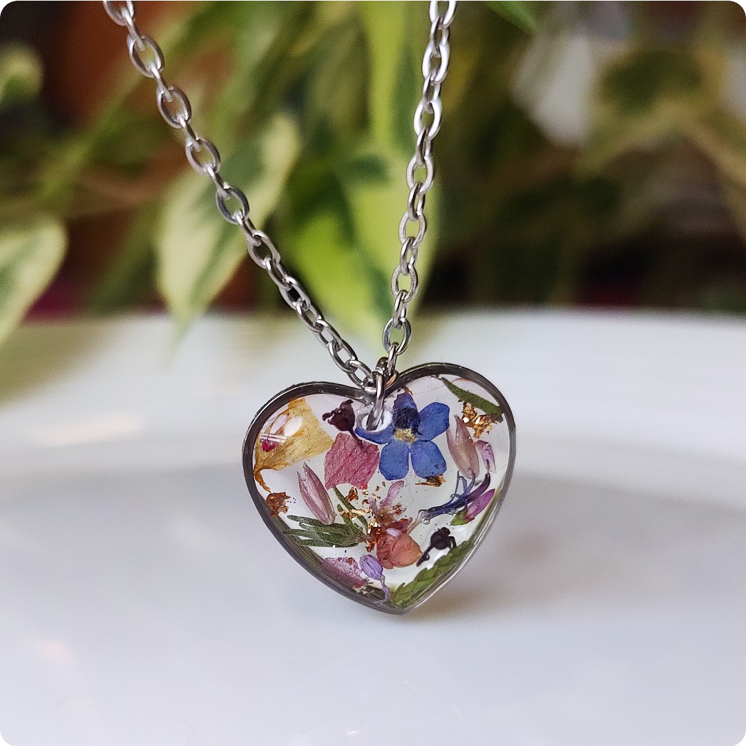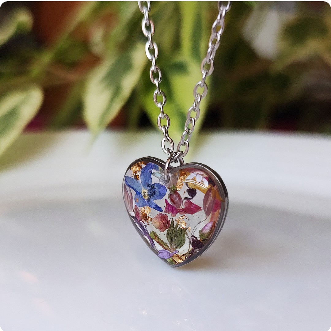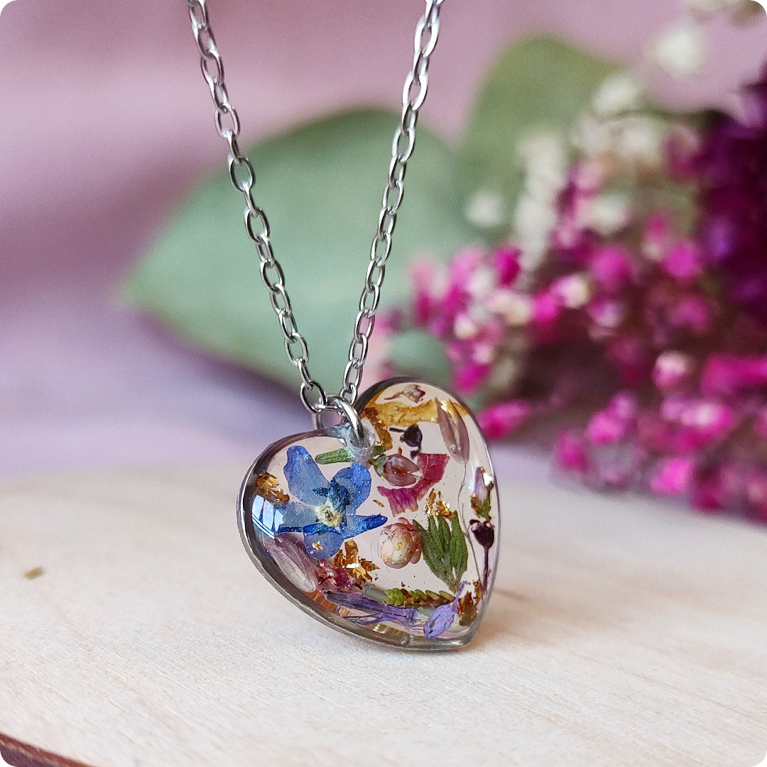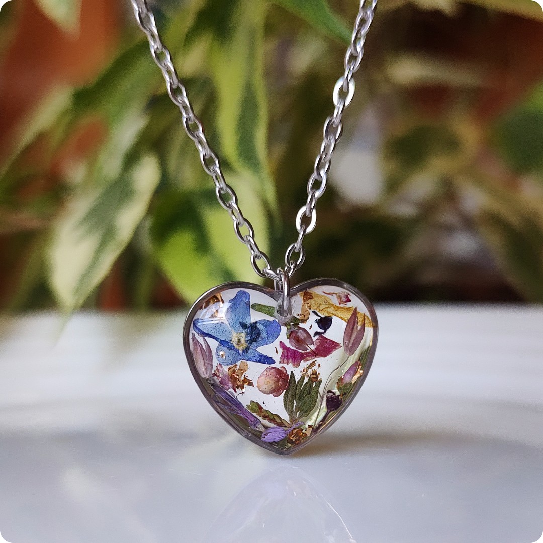 Naszyjnik serce z kwiatami na bezbarwnym tle. Biżuteria idealna dla kobiet lubiących kontakt z naturą i nietuzinkową biżuterię. Polecamy szczególnie dla tych z nas, które uwielbiają zadać szyku niewielkim elementem. Niewielkim rozmiarem, potężnym jednak w pierwszym wrażeniu!