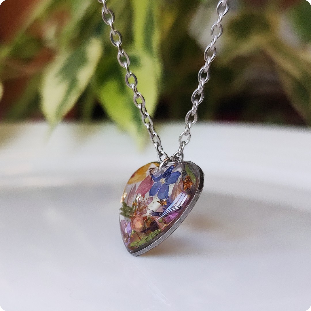 Żywica epoksydowa pozwala na utrwalenie kruchej i ulotnej cząstki natury. Jest krystaliczna i lekka. Stal szlachetna ma właściwości hipoalergiczne, nie odbarwia się i jest w dużym stopniu odporna na zarysowania. Przy odpowiedniej pielęgnacji biżuteria z tych materiałów jest gwarancją długiego użytkowania
