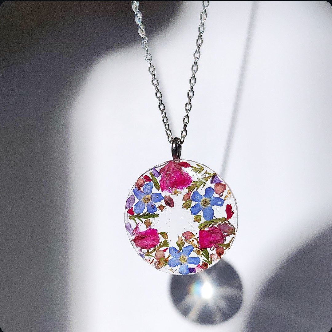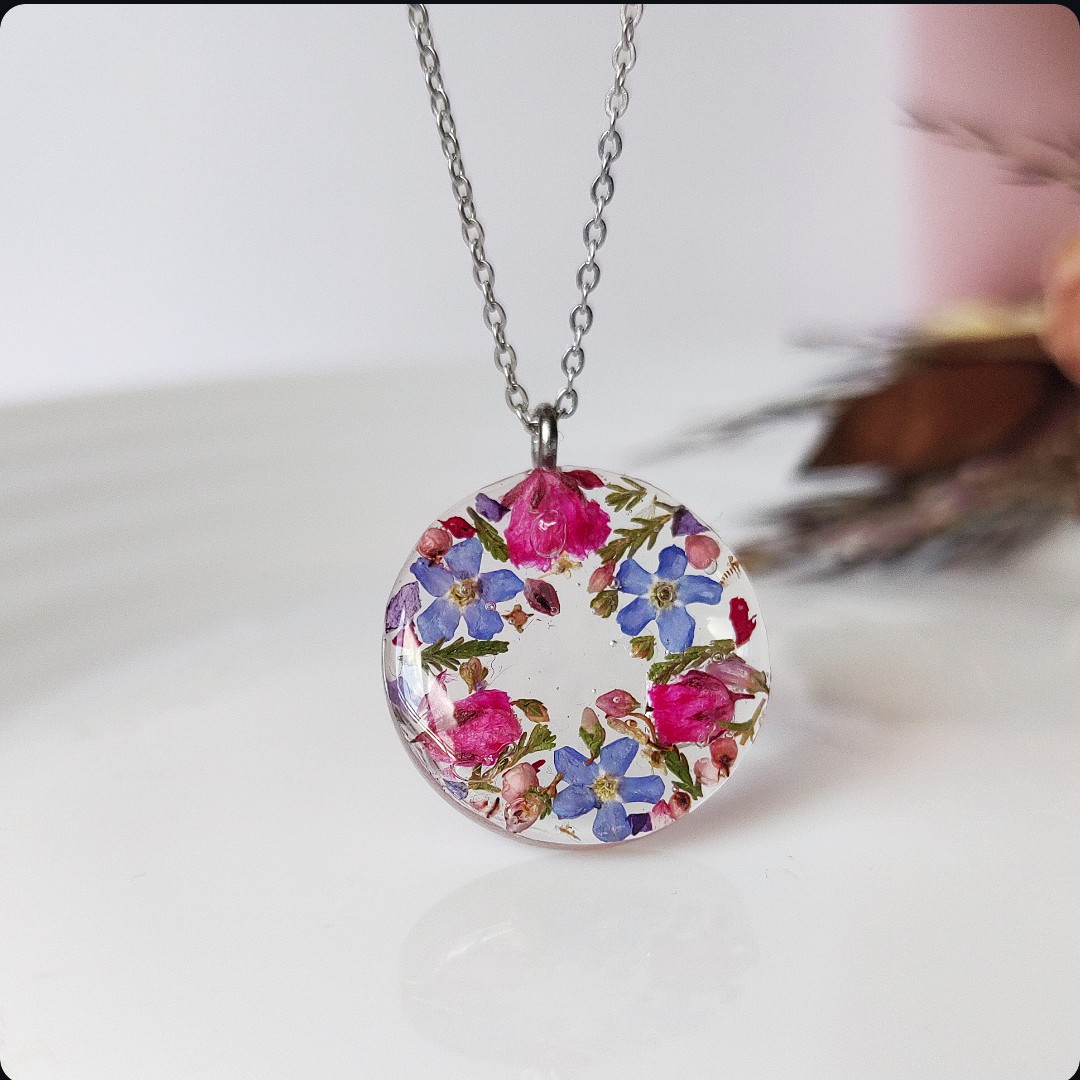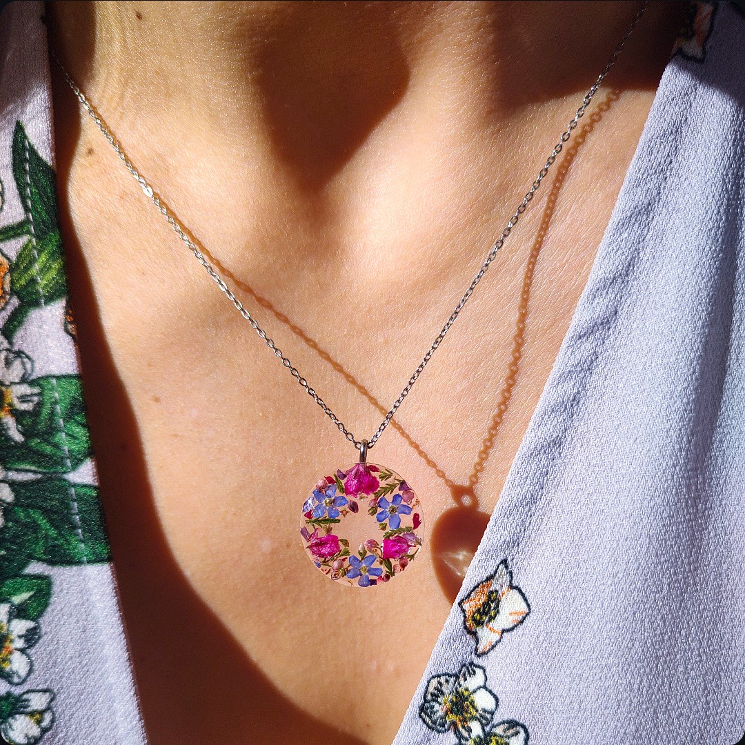 Naszyjnik wianek z kwiatami na bezbarwnym tle. Biżuteria idealna dla kobiet lubiących kontakt z naturą i nietuzinkową biżuterię. Polecamy szczególnie dla tych z nas, które uwielbiają zadać szyku niewielkim elementem. Niewielkim rozmiarem, potężnym jednak w pierwszym wrażeniu!