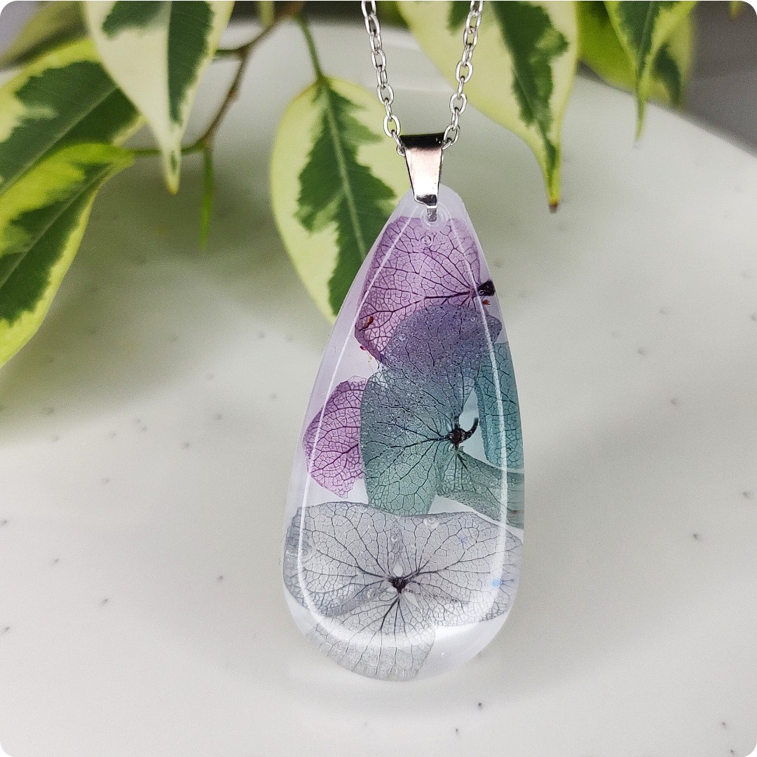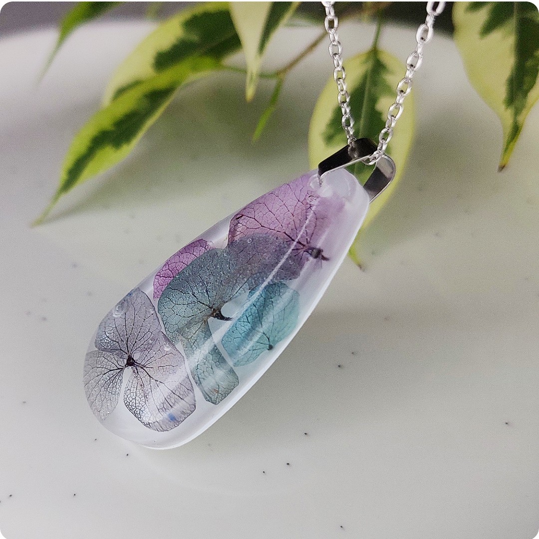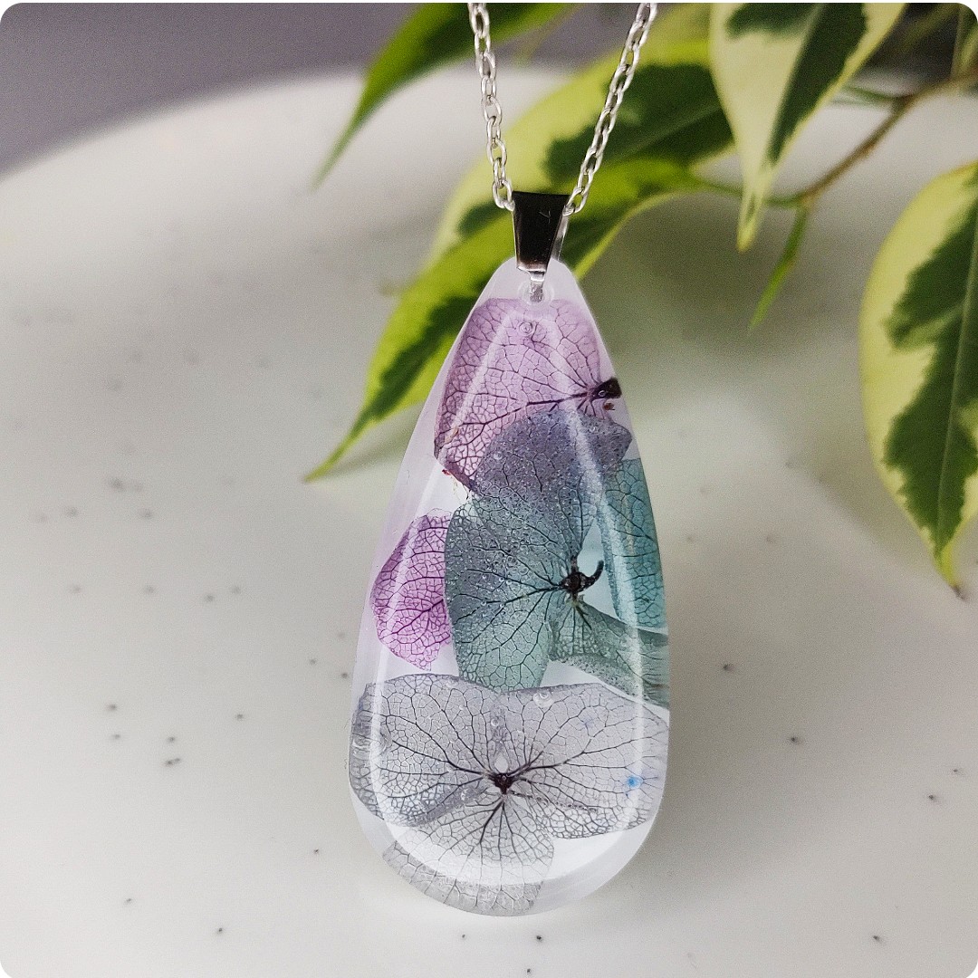 Naszyjnik z kwiatami hortensji na białym tle. Biżuteria idealna dla kobiet lubiących kontakt z naturą i nietuzinkową biżuterię. Polecamy szczególnie dla tych z nas, które uwielbiają zadać szyku niewielkim elementem. Niewielkim rozmiarem, potężnym jednak w pierwszym wrażeniu!