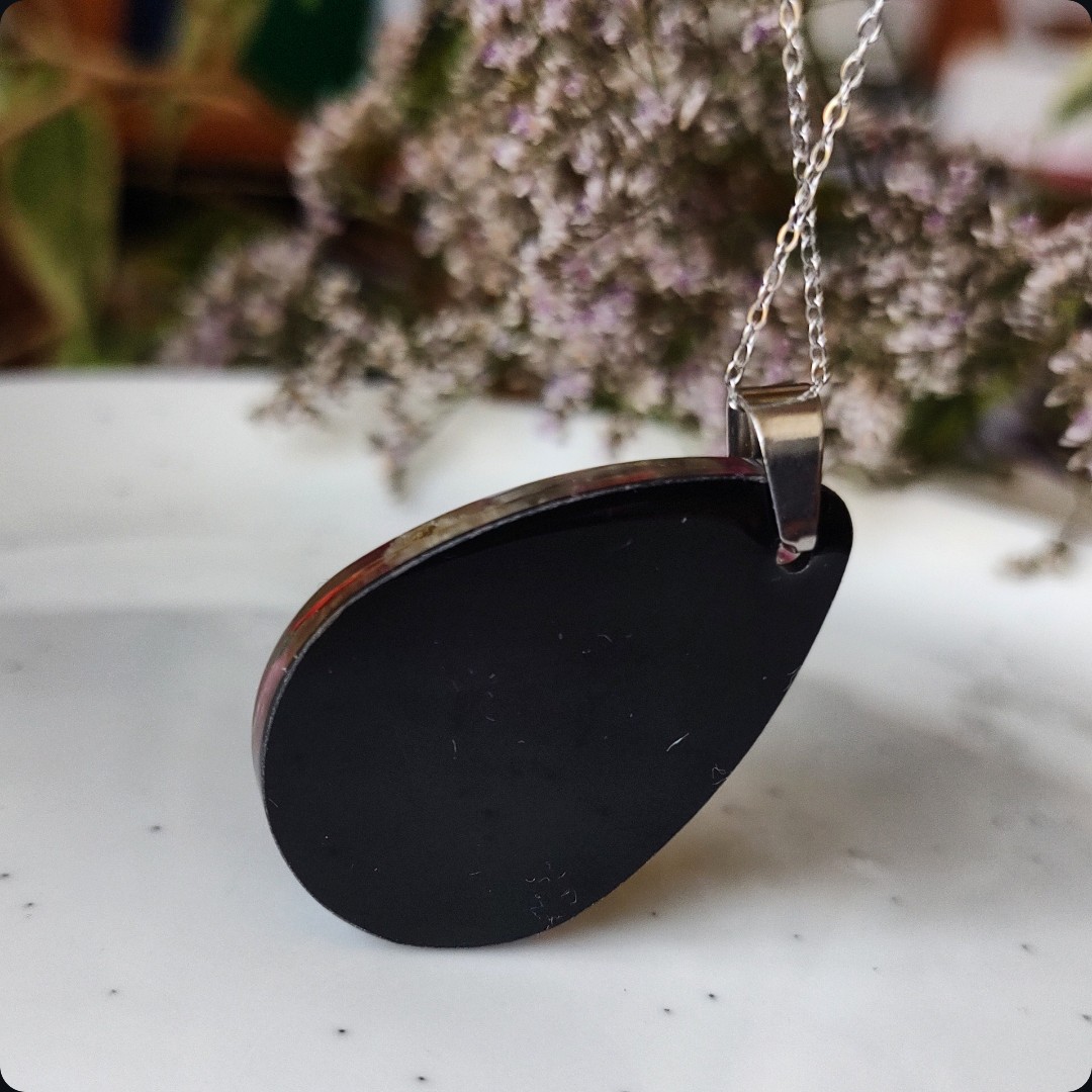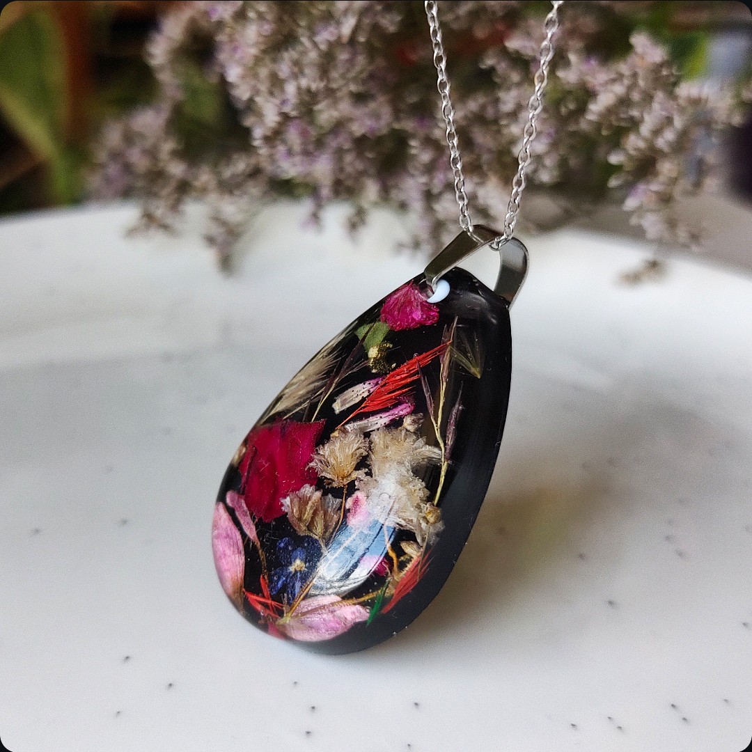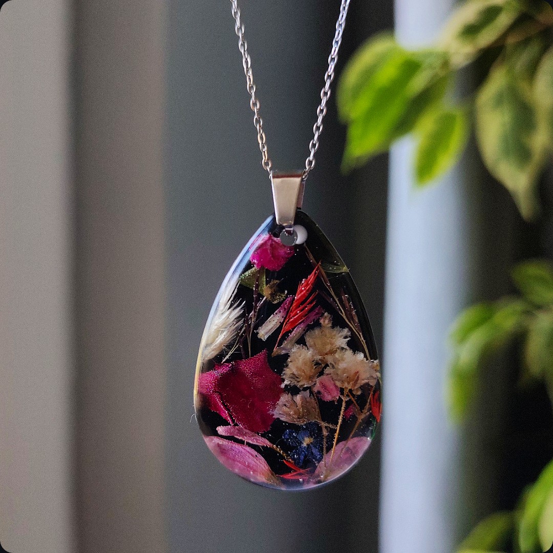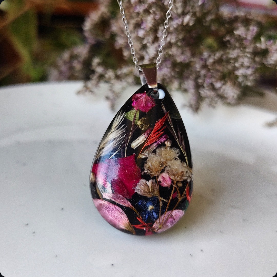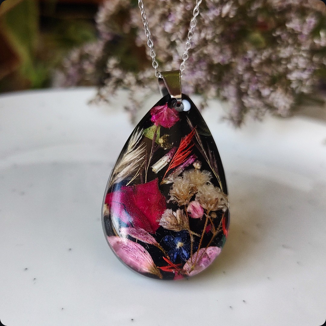 Żywica epoksydowa pozwala na utrwalenie kruchej i ulotnej cząstki natury. Jest krystaliczna i lekka. Stal szlachetna ma właściwości hipoalergiczne, nie odbarwia się i jest w dużym stopniu odporna na zarysowania. Przy odpowiedniej pielęgnacji biżuteria z tych materiałów jest gwarancją długiego użytkowania
