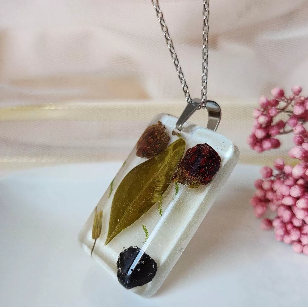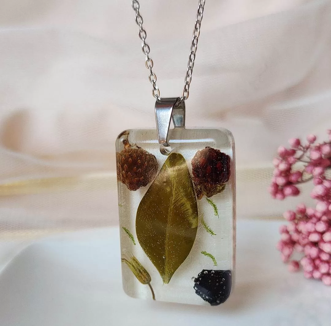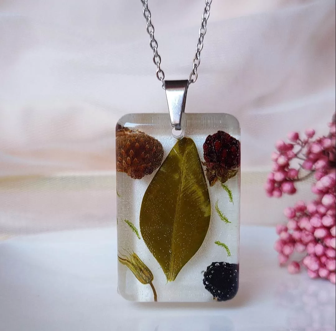 Żywica epoksydowa pozwala na utrwalenie kruchej i ulotnej cząstki natury. Jest krystaliczna i lekka. Stal szlachetna ma właściwości hipoalergiczne, nie odbarwia się i jest w dużym stopniu odporna na zarysowania. Przy odpowiedniej pielęgnacji biżuteria z tych materiałów jest gwarancją długiego użytkowania