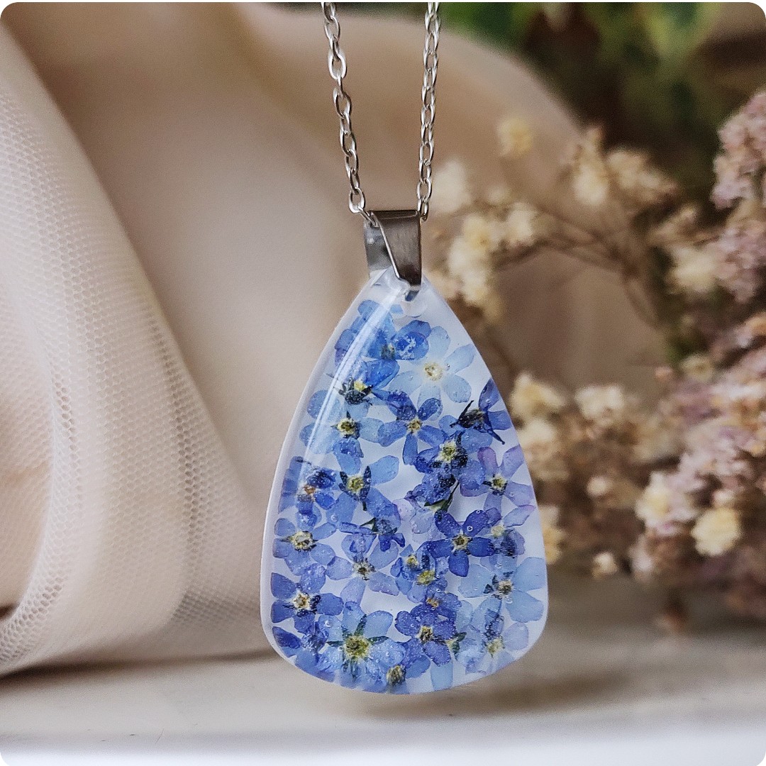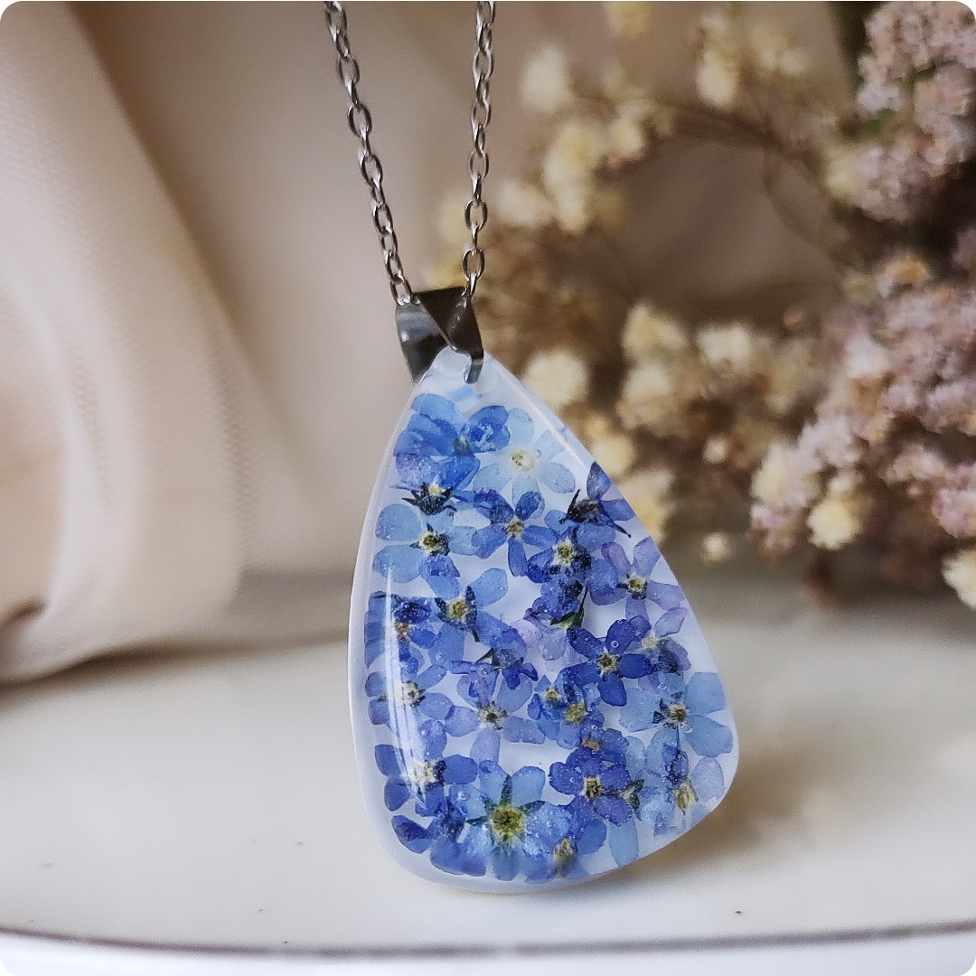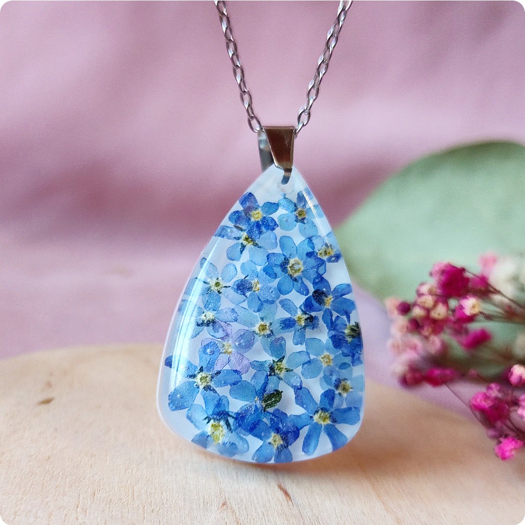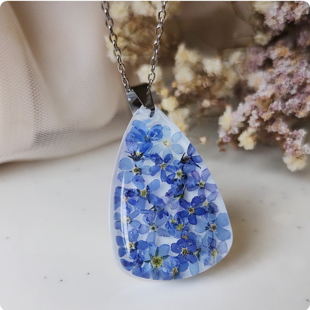 Naszyjnik z niezapominajkami na białym tle , niezapominajka jako symbol prawdziwej miłości, wierności, pamięci i zaufania będzie idealnym pomysłem na prezent na każdą okazje. Biżuteria idealna dla kobiet lubiących kontakt z naturą i nietuzinkową biżuterię.