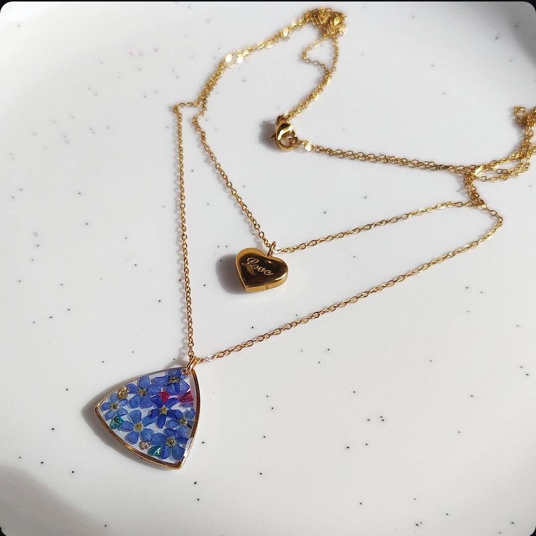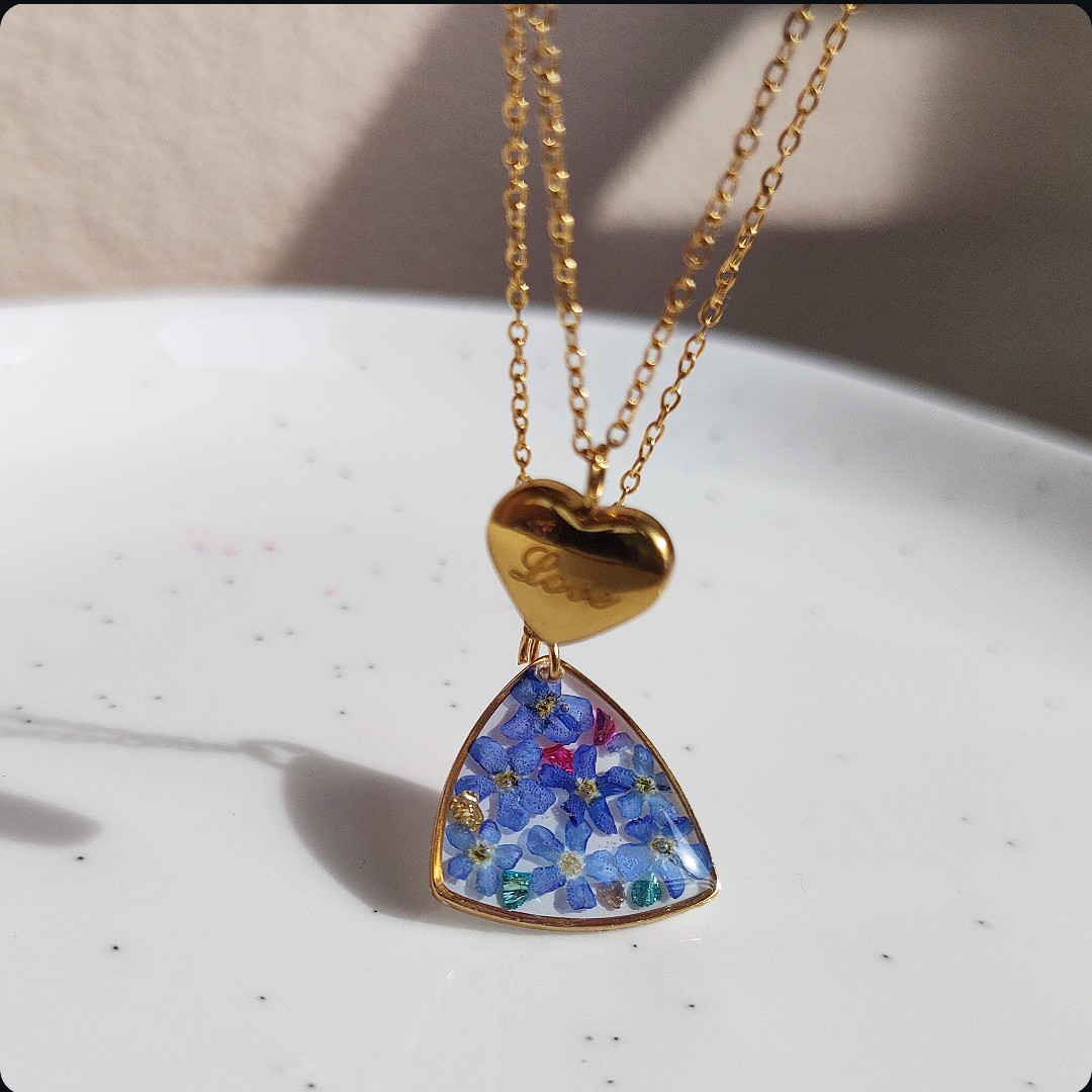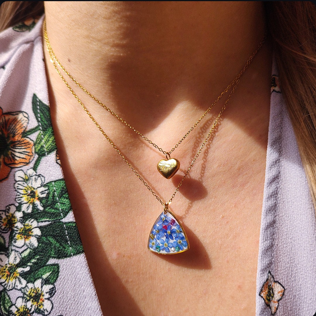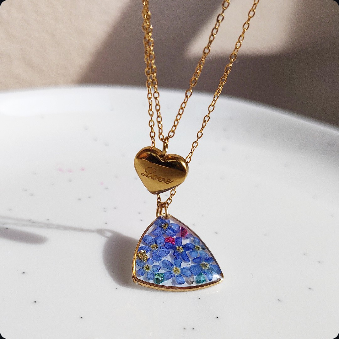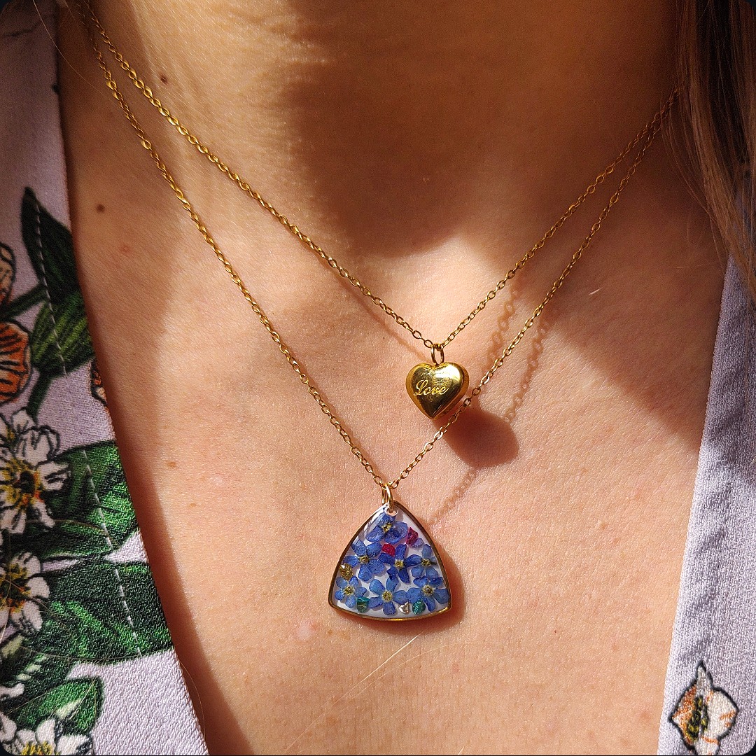 Naszyjnik z niezapominajkami i płatkami złota na białym tle, niezapominajka jako symbol prawdziwej miłości, wierności, pamięci i zaufania będzie idealnym pomysłem na prezent na każdą okazje. Biżuteria idealna dla kobiet lubiących kontakt z naturą i nietuzinkową biżuterię.