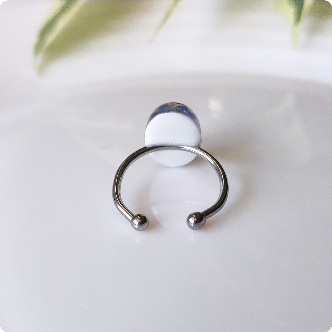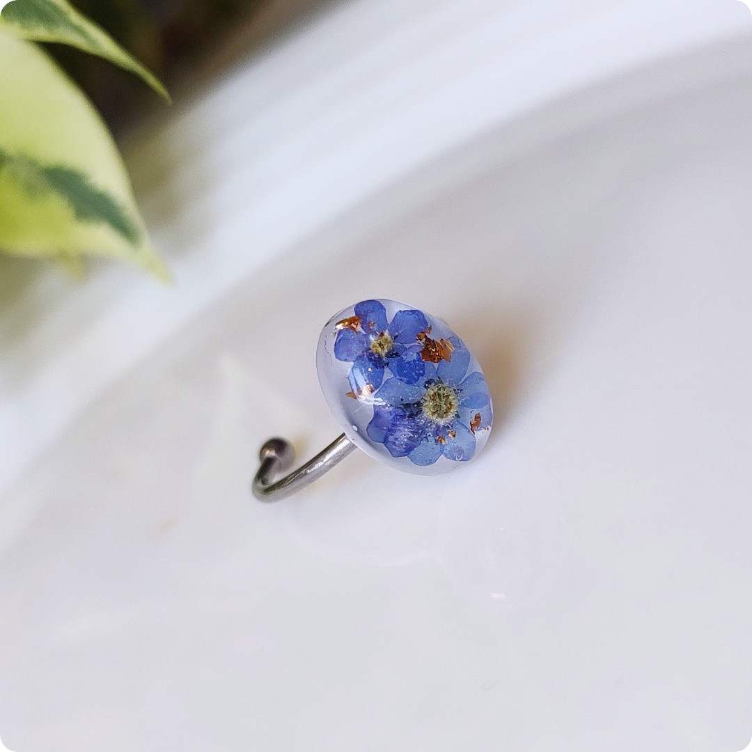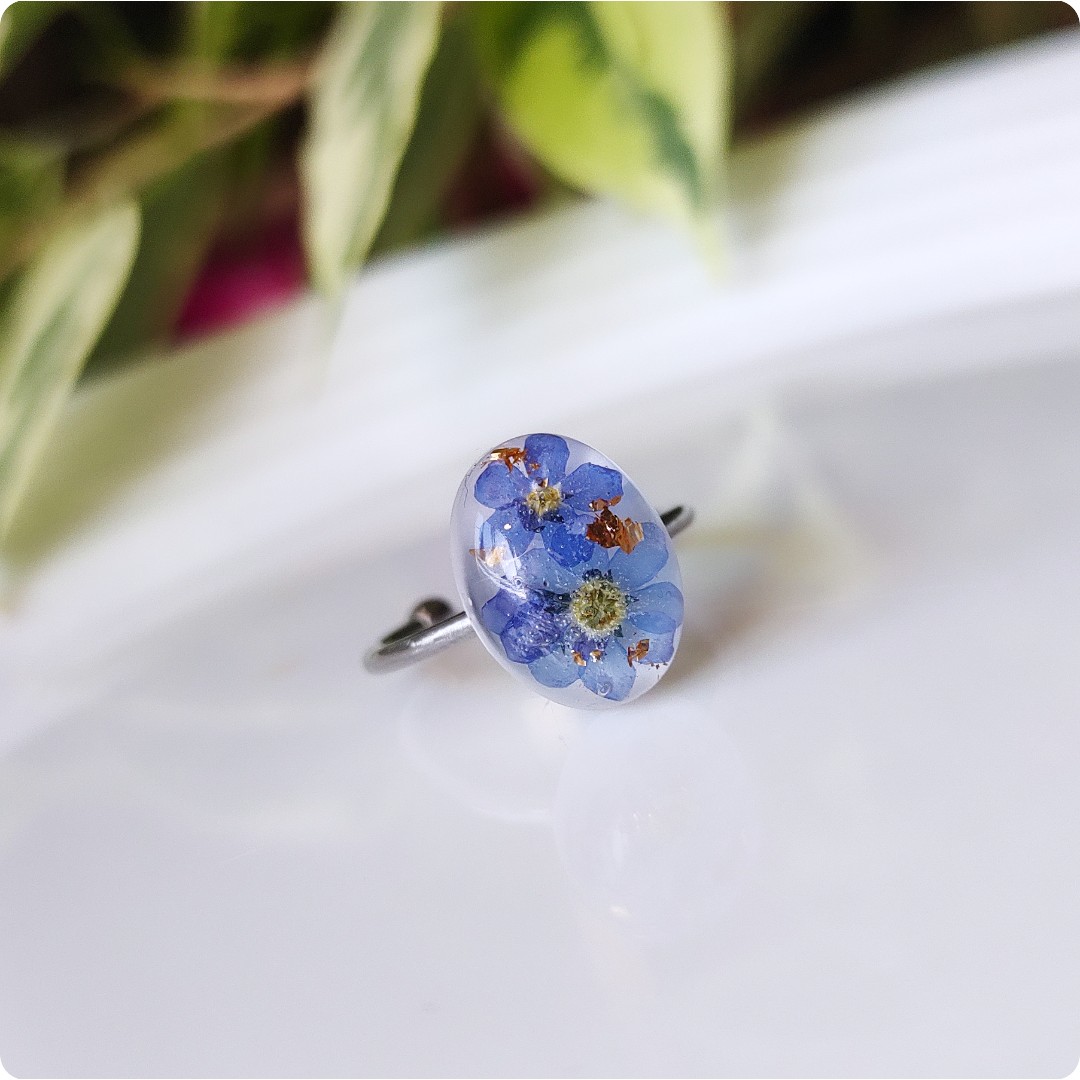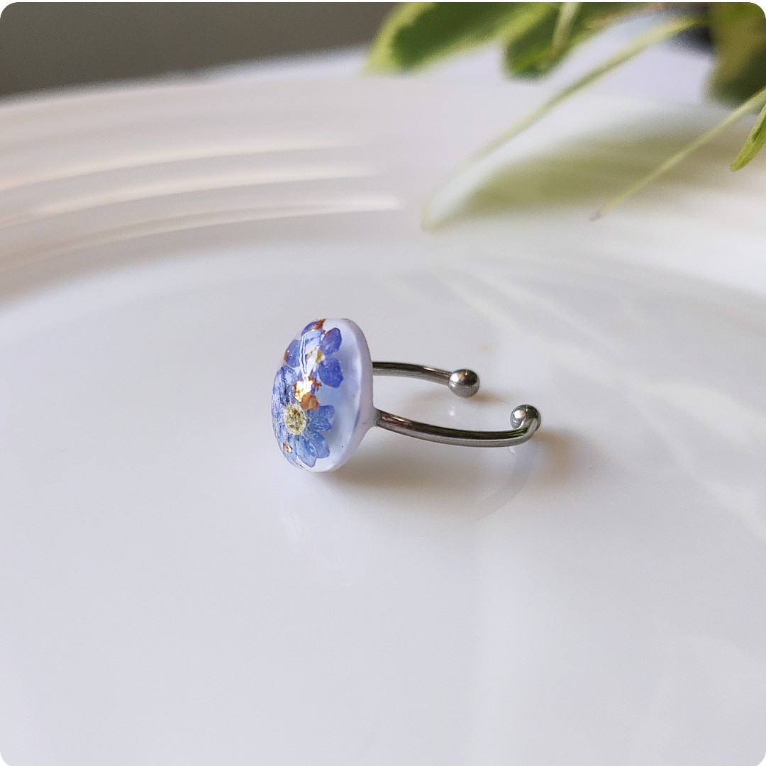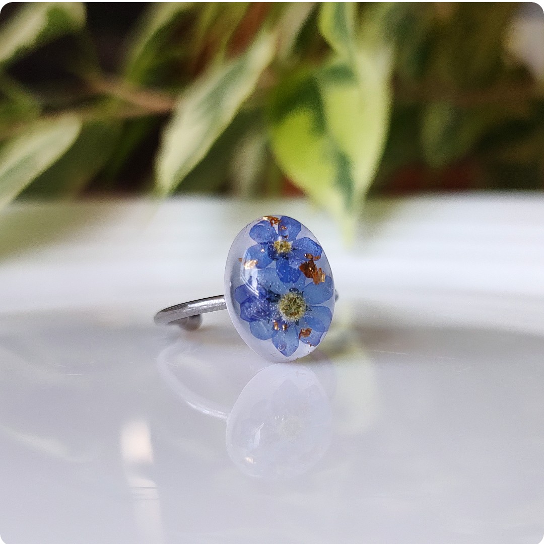 Regulowany pierścionek z niezapominajkami na białym tle, niezapominajka jako symbol prawdziwej miłości, wierności, pamięci i zaufania będzie idealnym pomysłem na prezent na każdą okazje. Biżuteria idealna dla kobiet lubiących kontakt z naturą i nietuzinkową biżuterię.